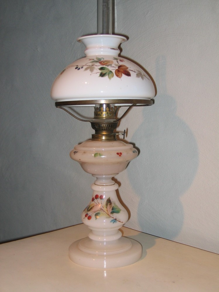 Melkglazen olielamp met opgeschilderd bloemmotief, b...
