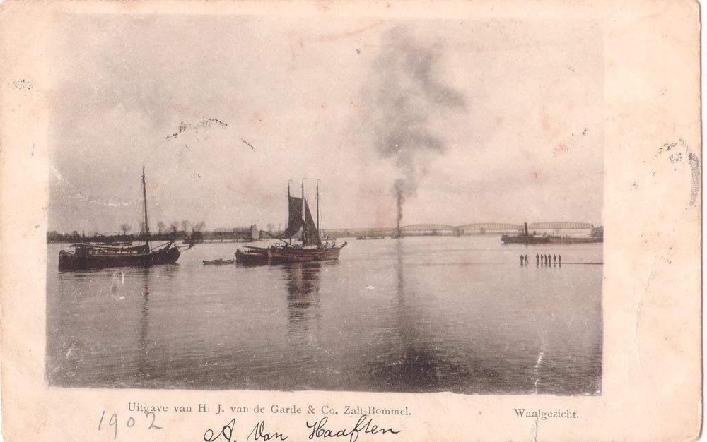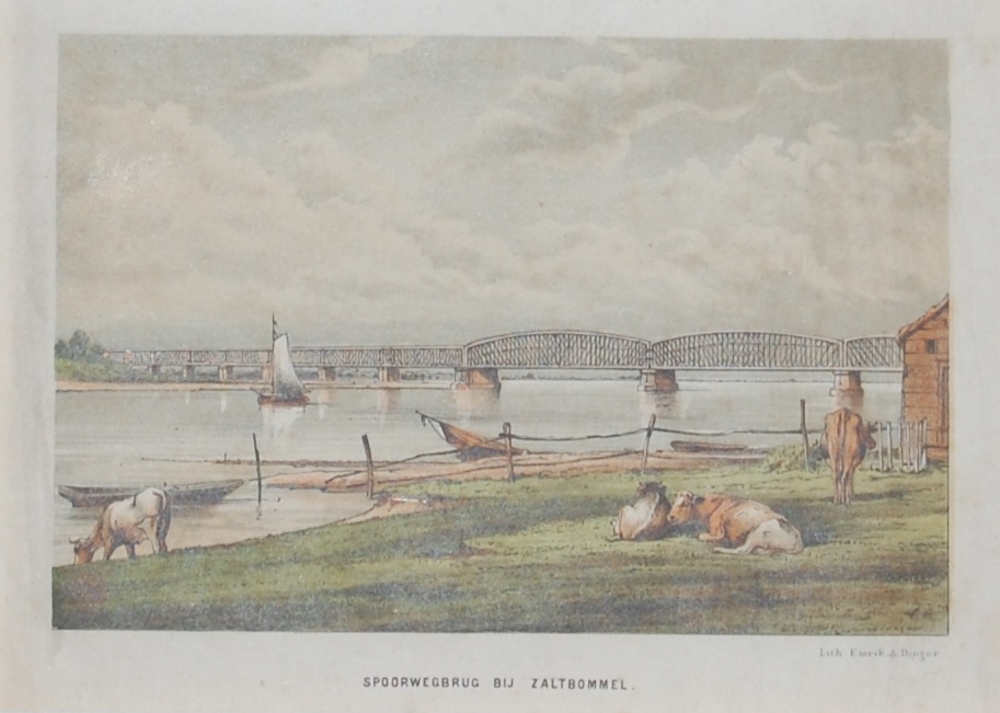 Gezicht vanaf de rivier de Waal op de spoorbrug bij ...