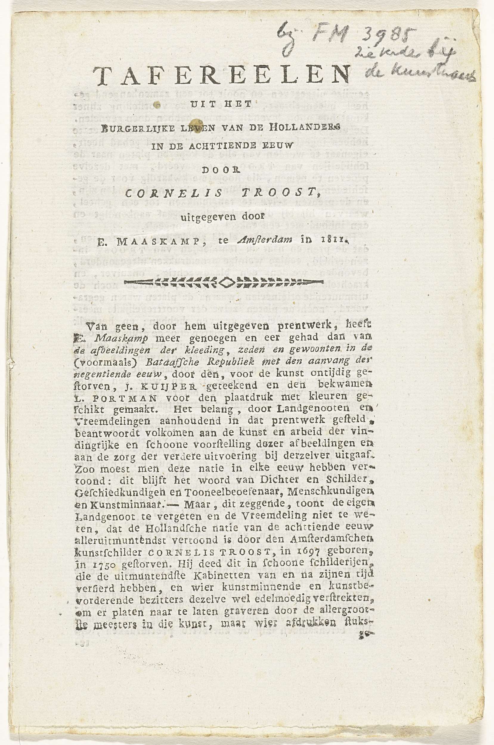 Prospectus voor de uitgave van de serie prenten: Taf...
