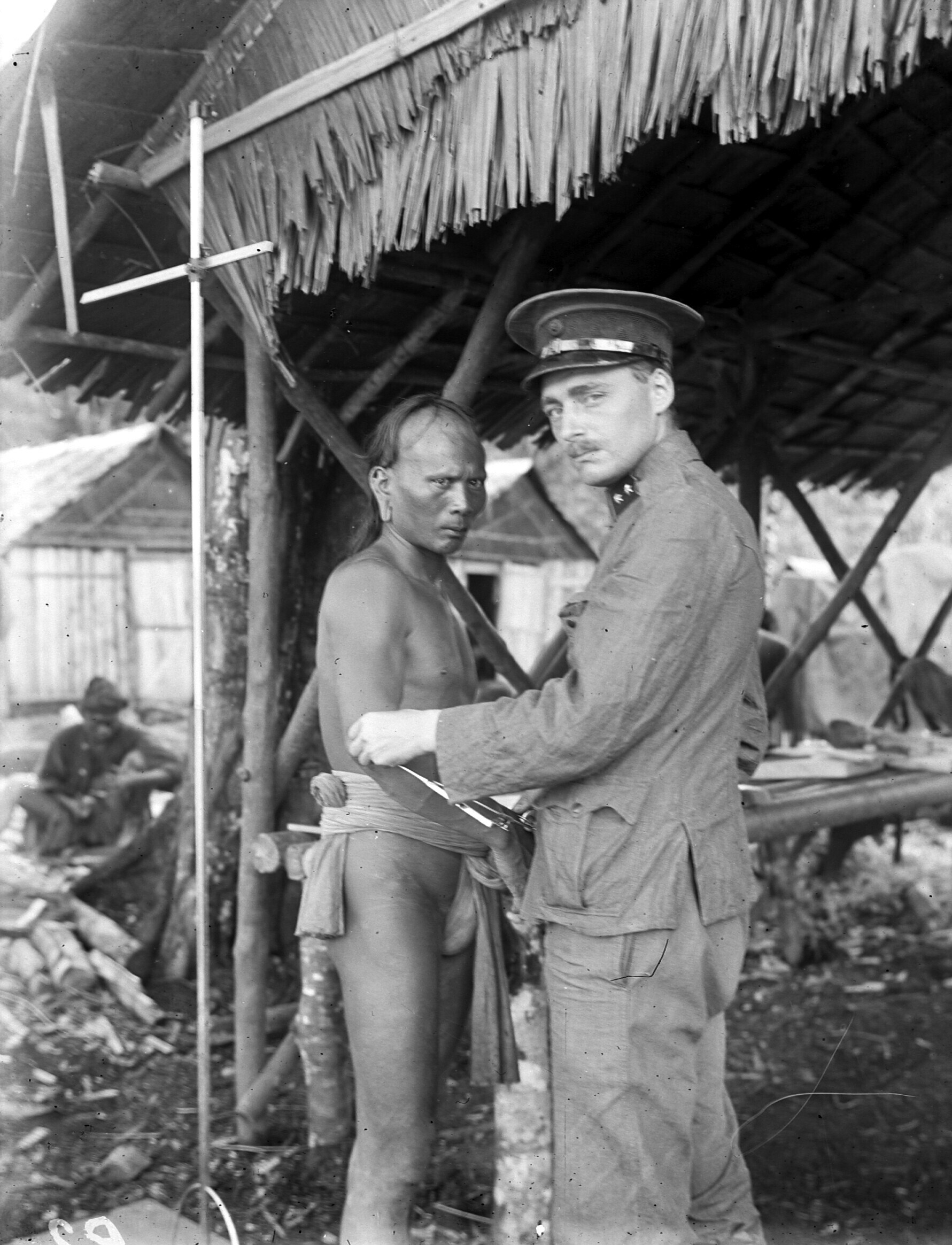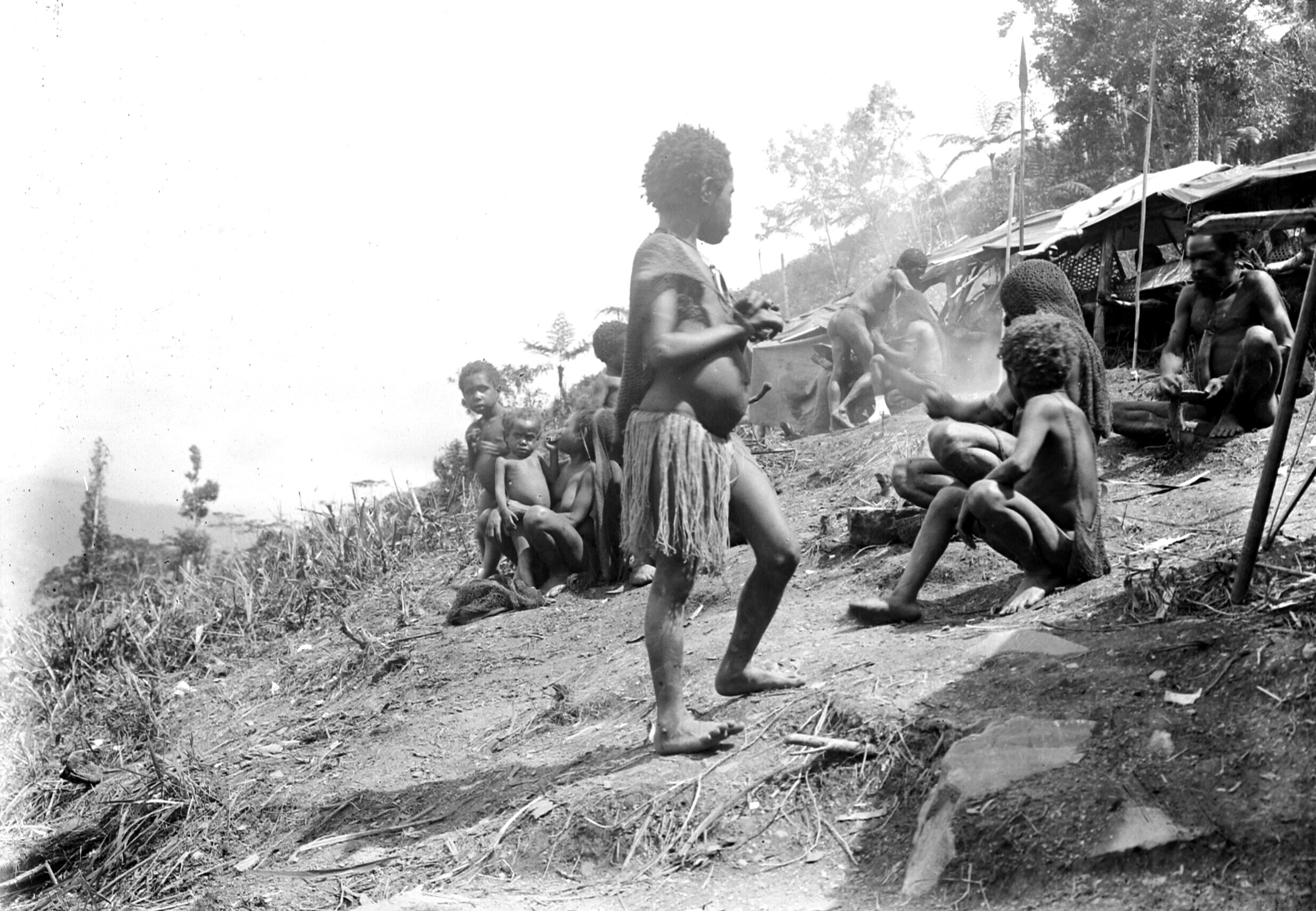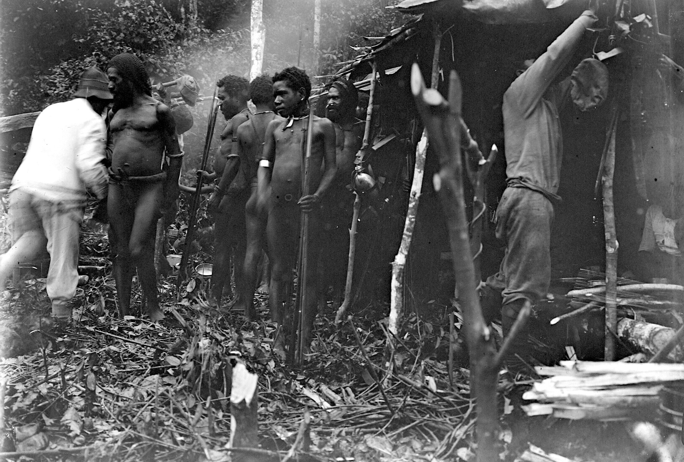 Centr. N.Guinee Exp. 1920. Beekbivak; mantri, jongen...