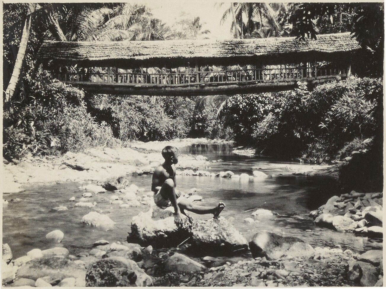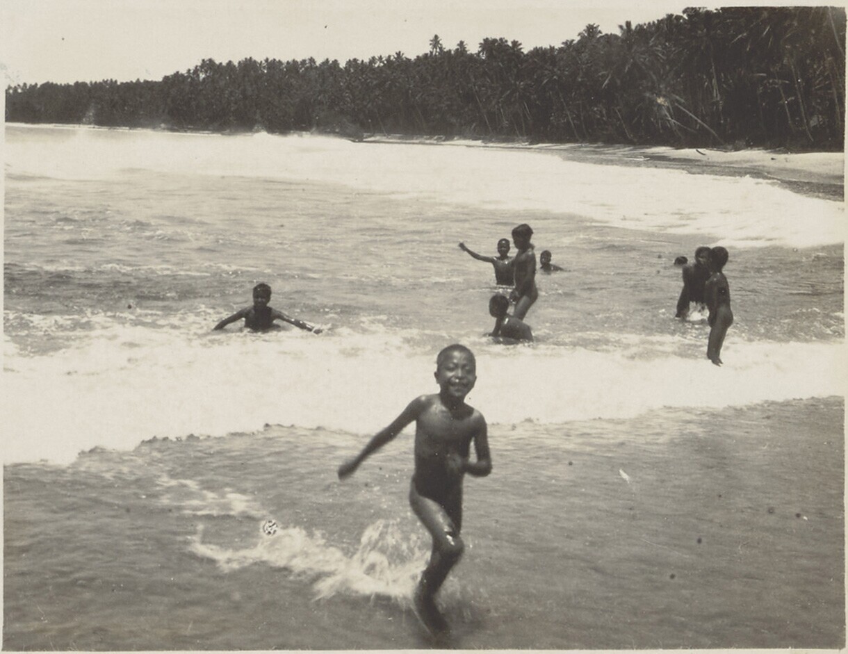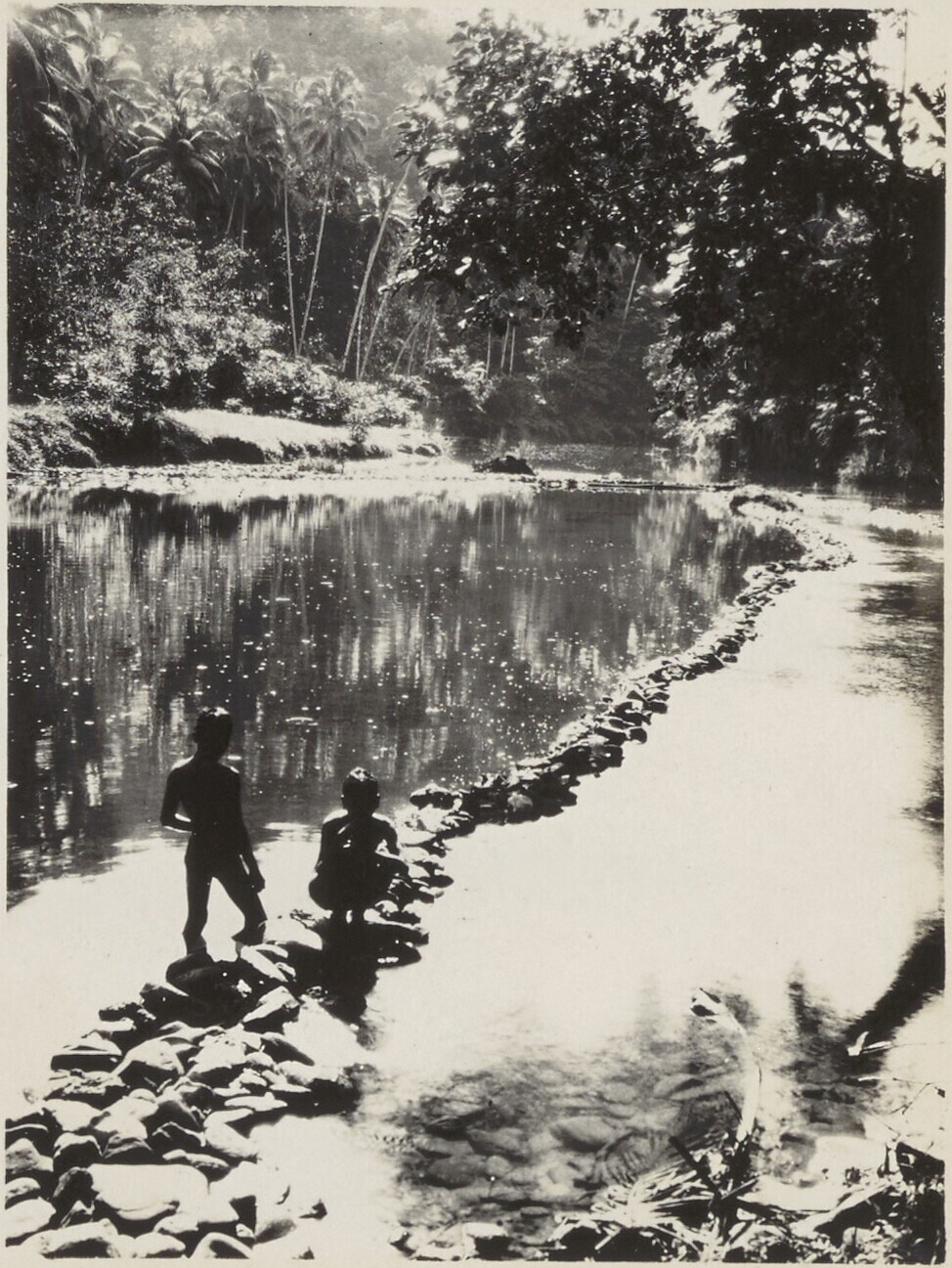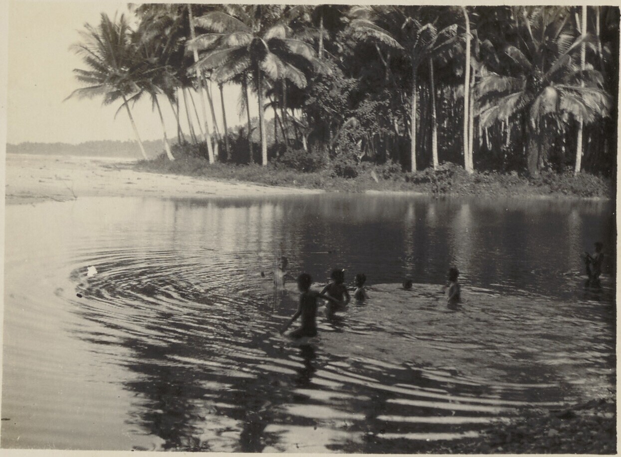 Badende jongens in een met stenen ingedijkt stuk wat...