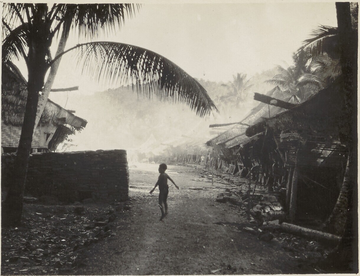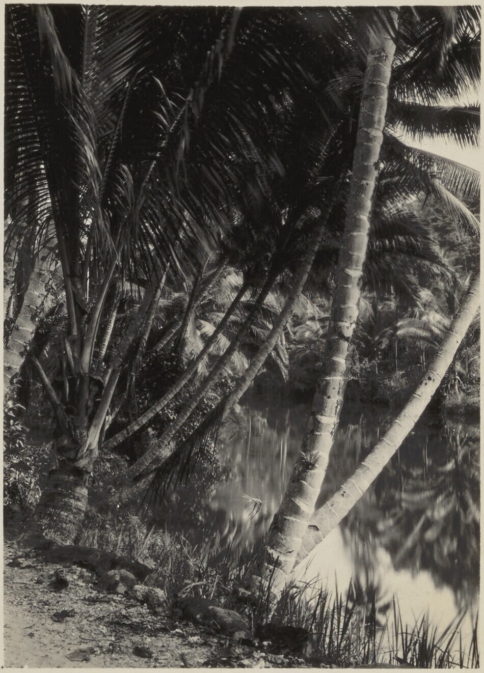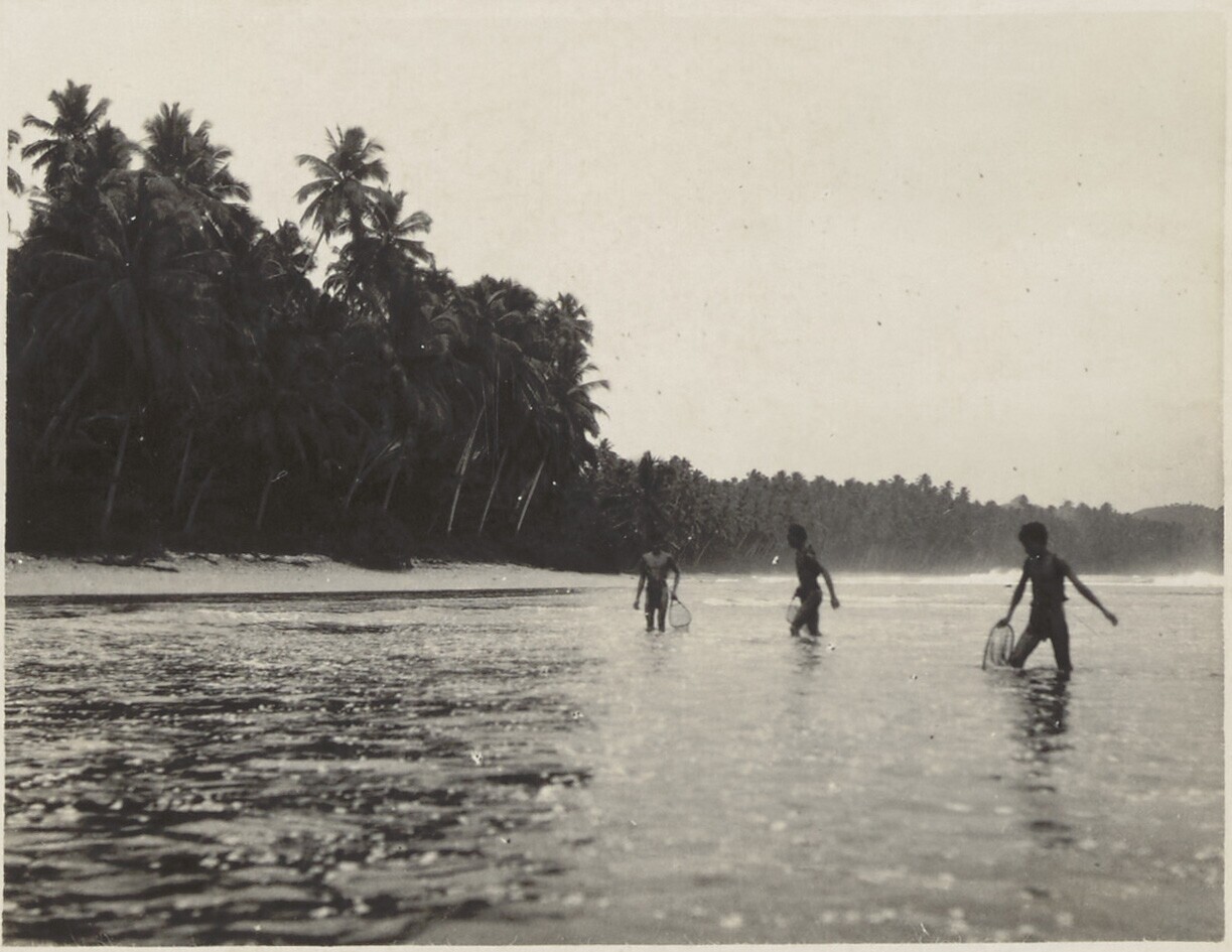 Badende jongens in een met stenen ingedijkt stuk wat...