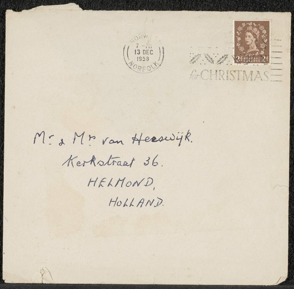 Envelop bij kerstkaart van J.B. Pick and Marion aan ...