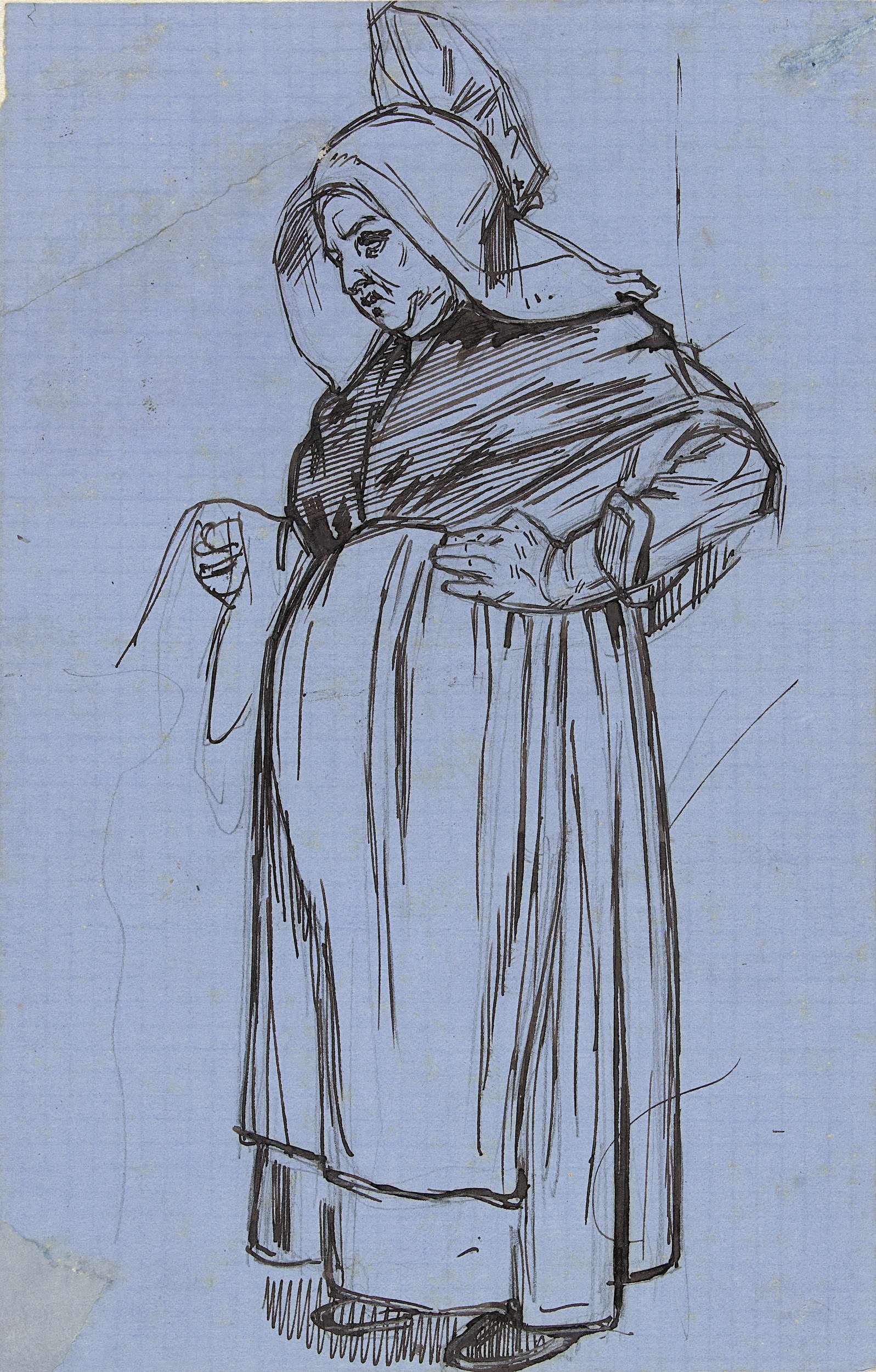 Staande vrouw met kap op haar hoofd