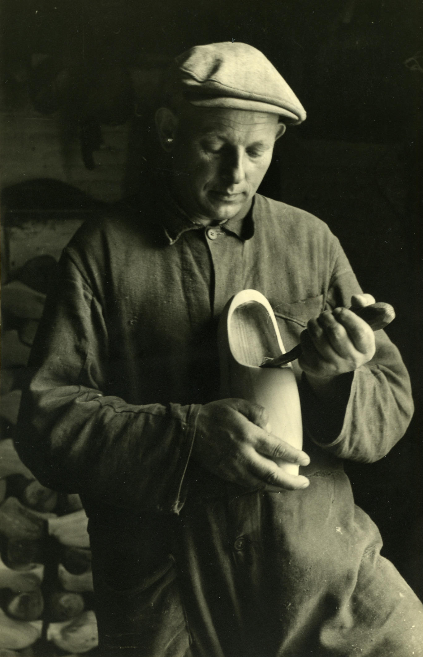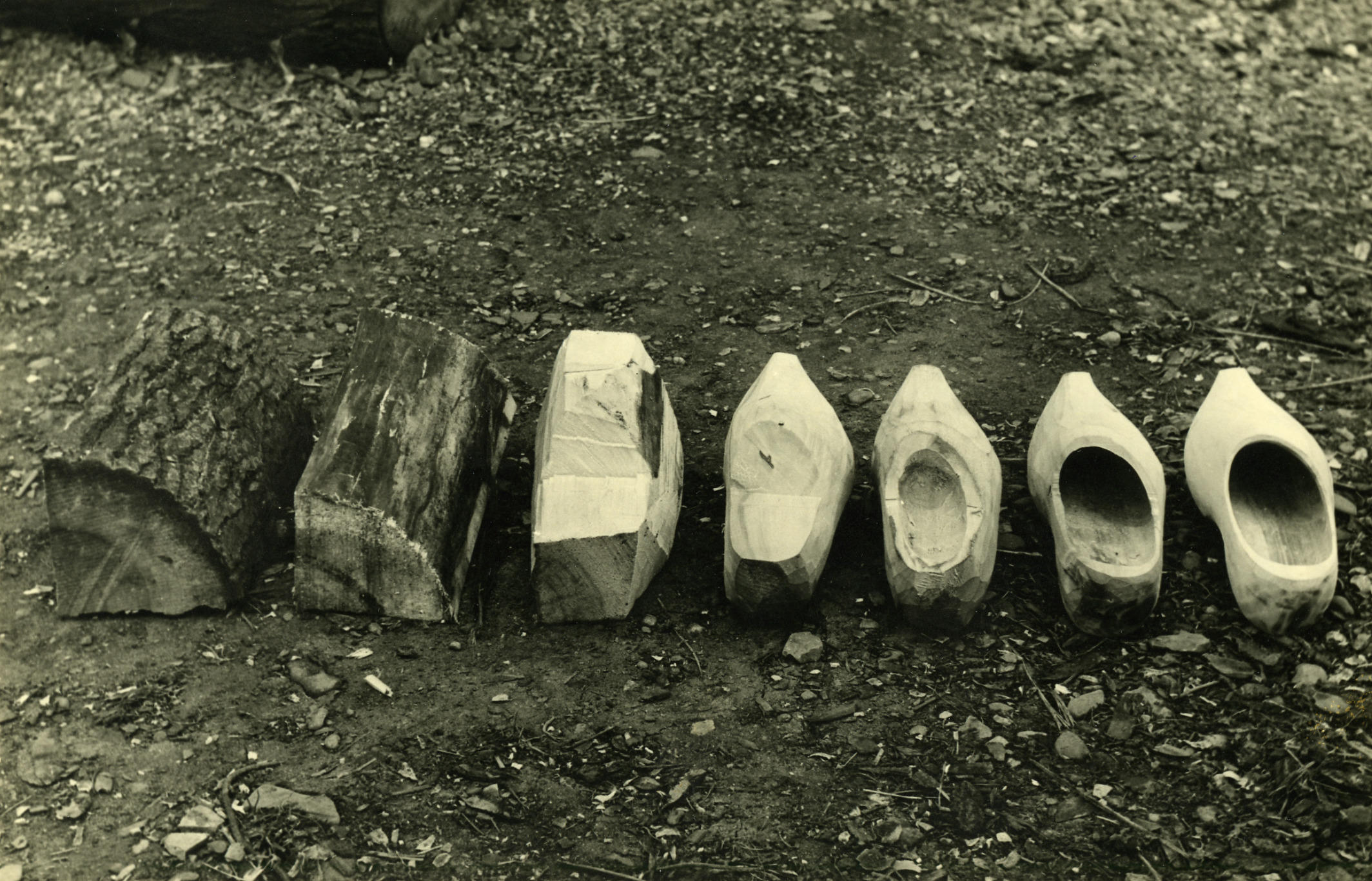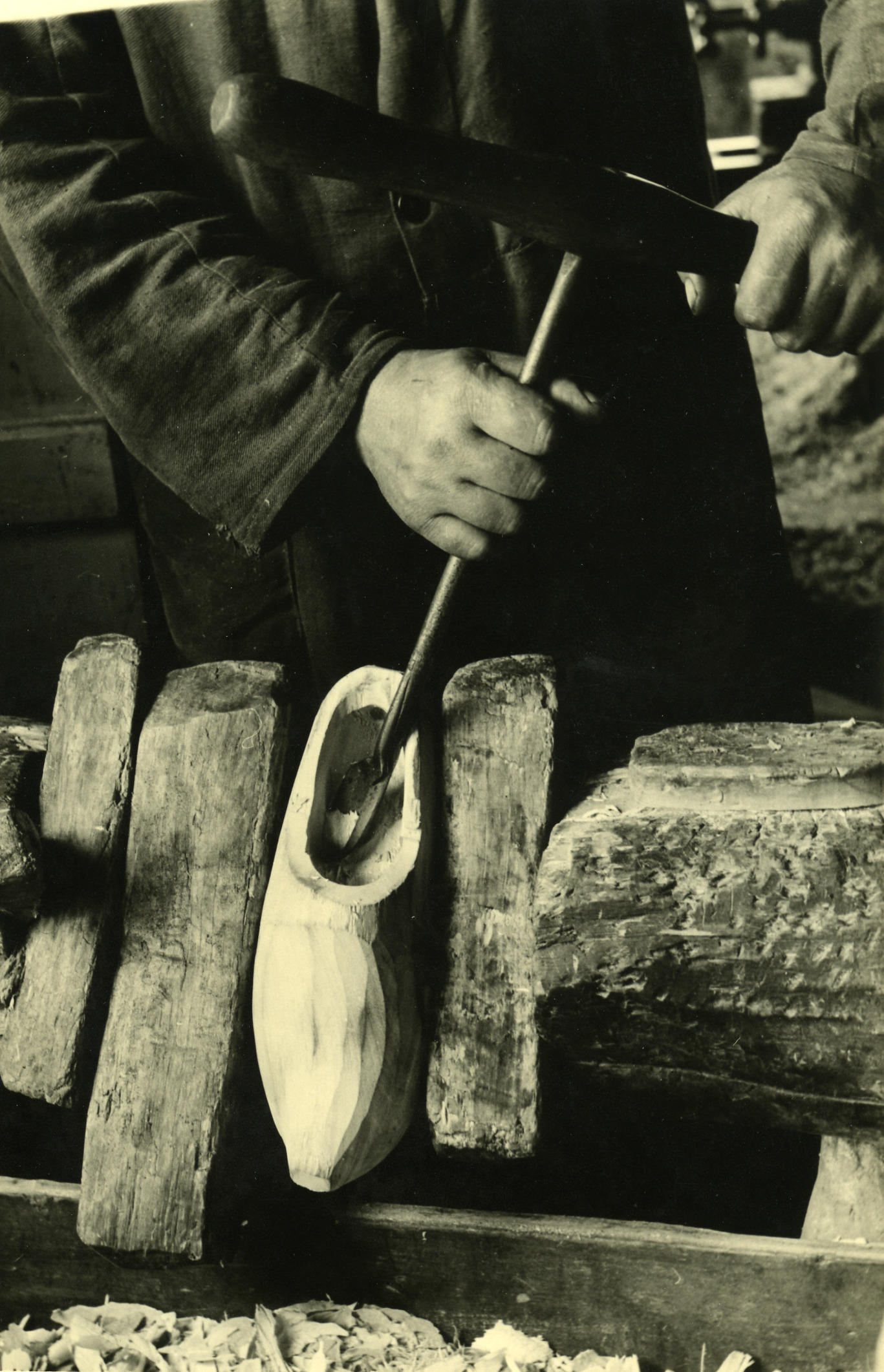 Klompenmaken, Veessen, 1945 (zwart-wit foto)