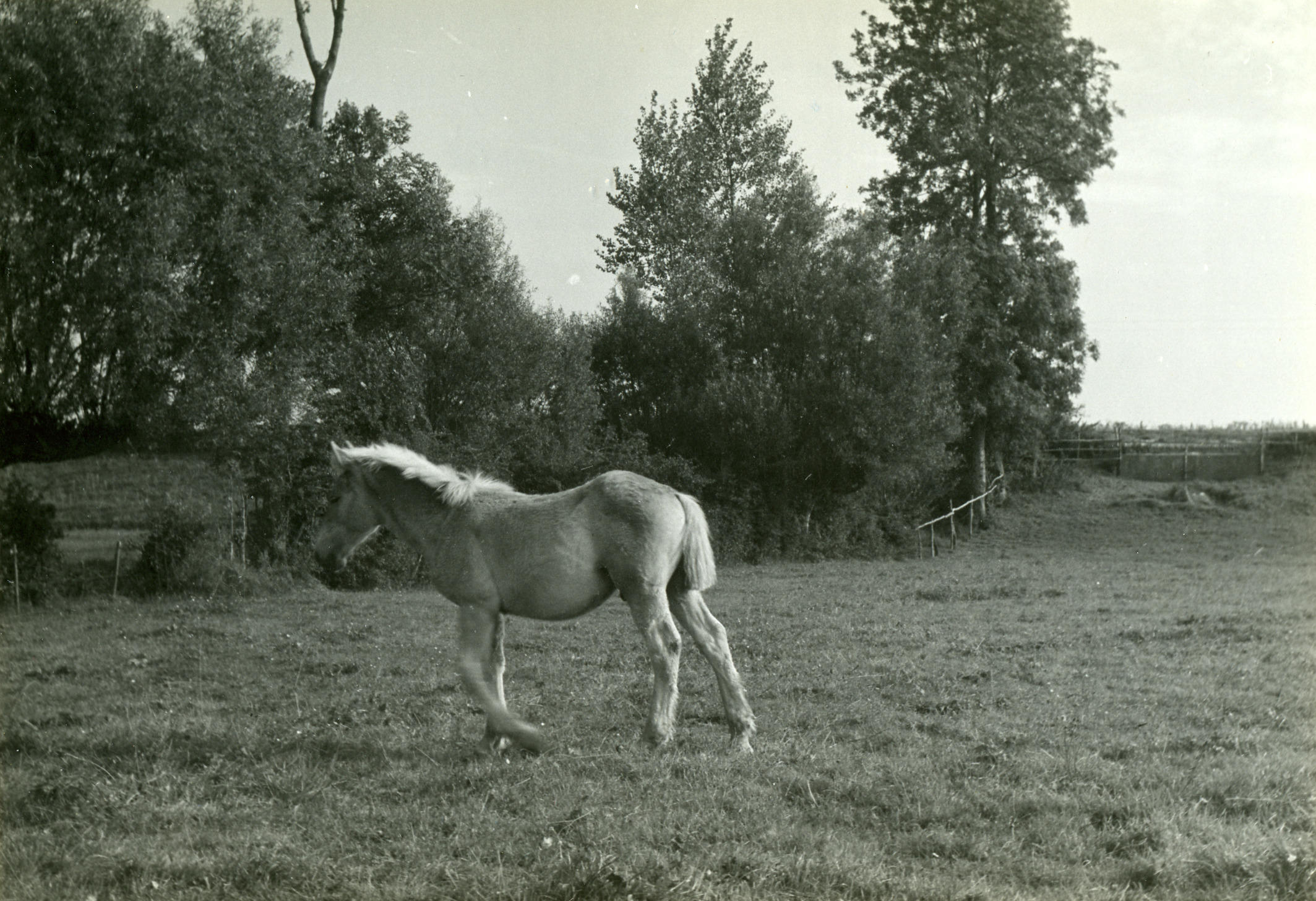 Paard in een wei bij Veessen, 1945 (zwart-wit foto)
