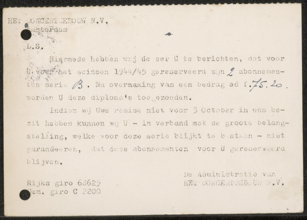 Berichtkaart van het Concertgebouw te Amsterdam