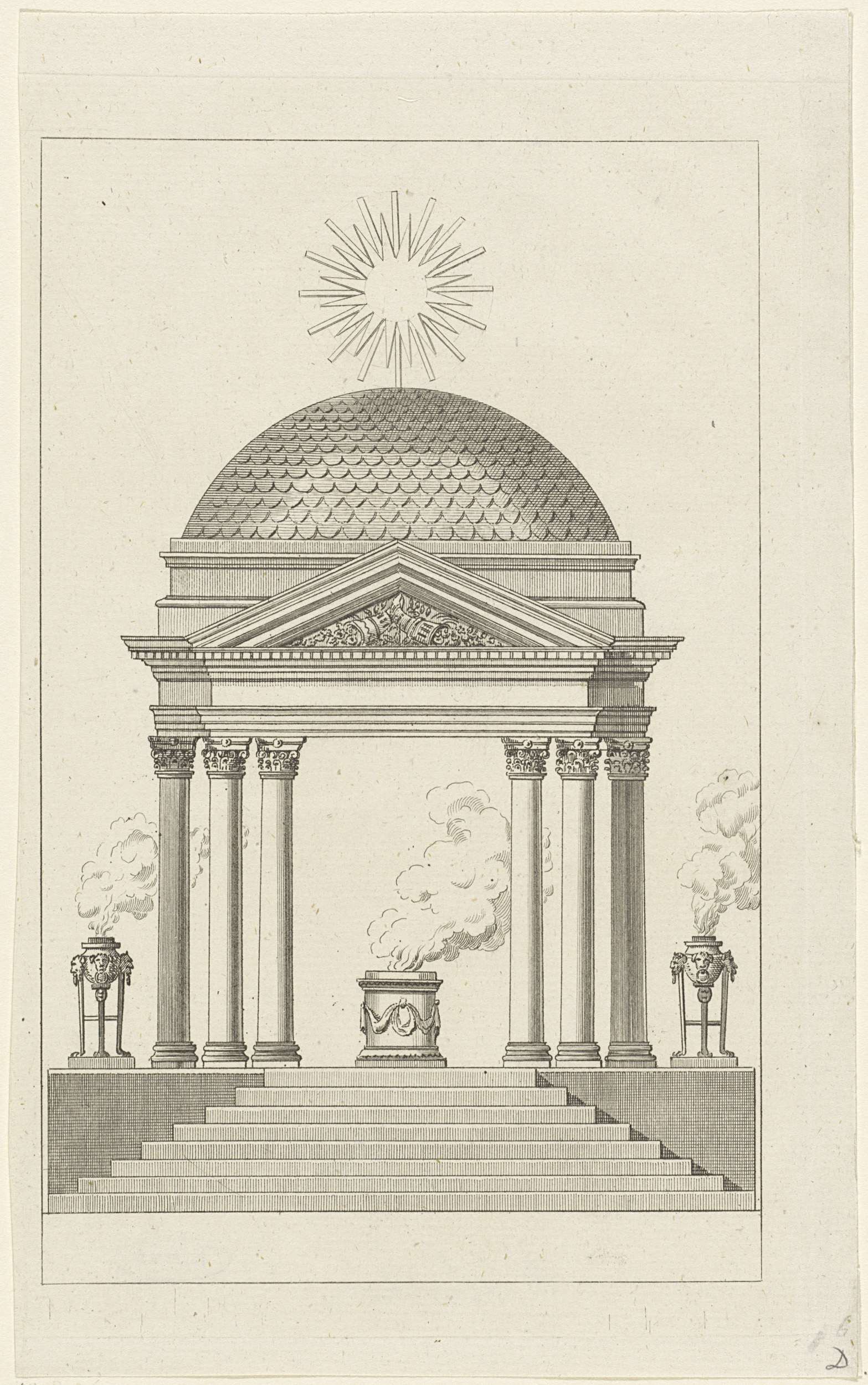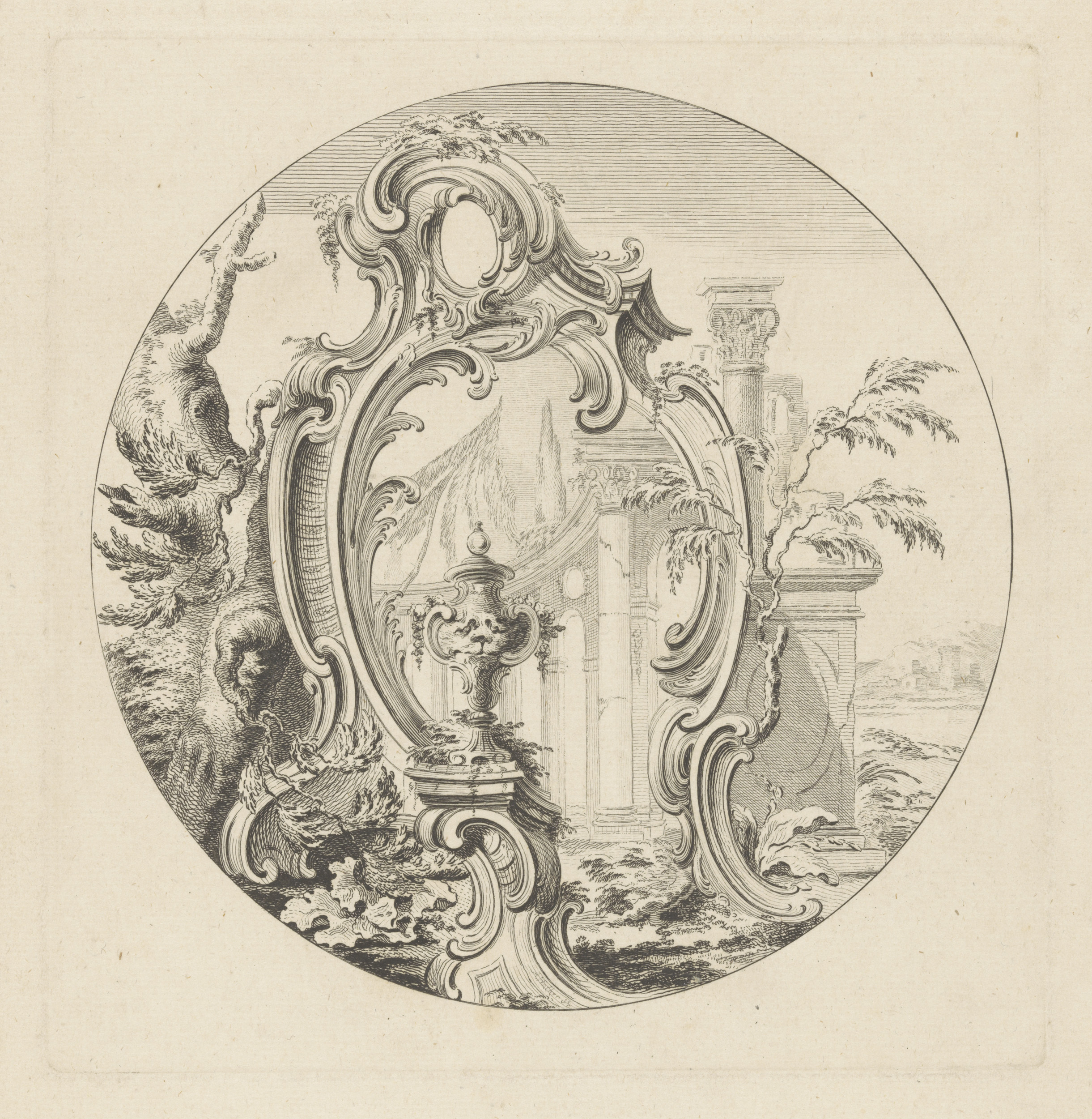 Cartouche in landschap met colonnades