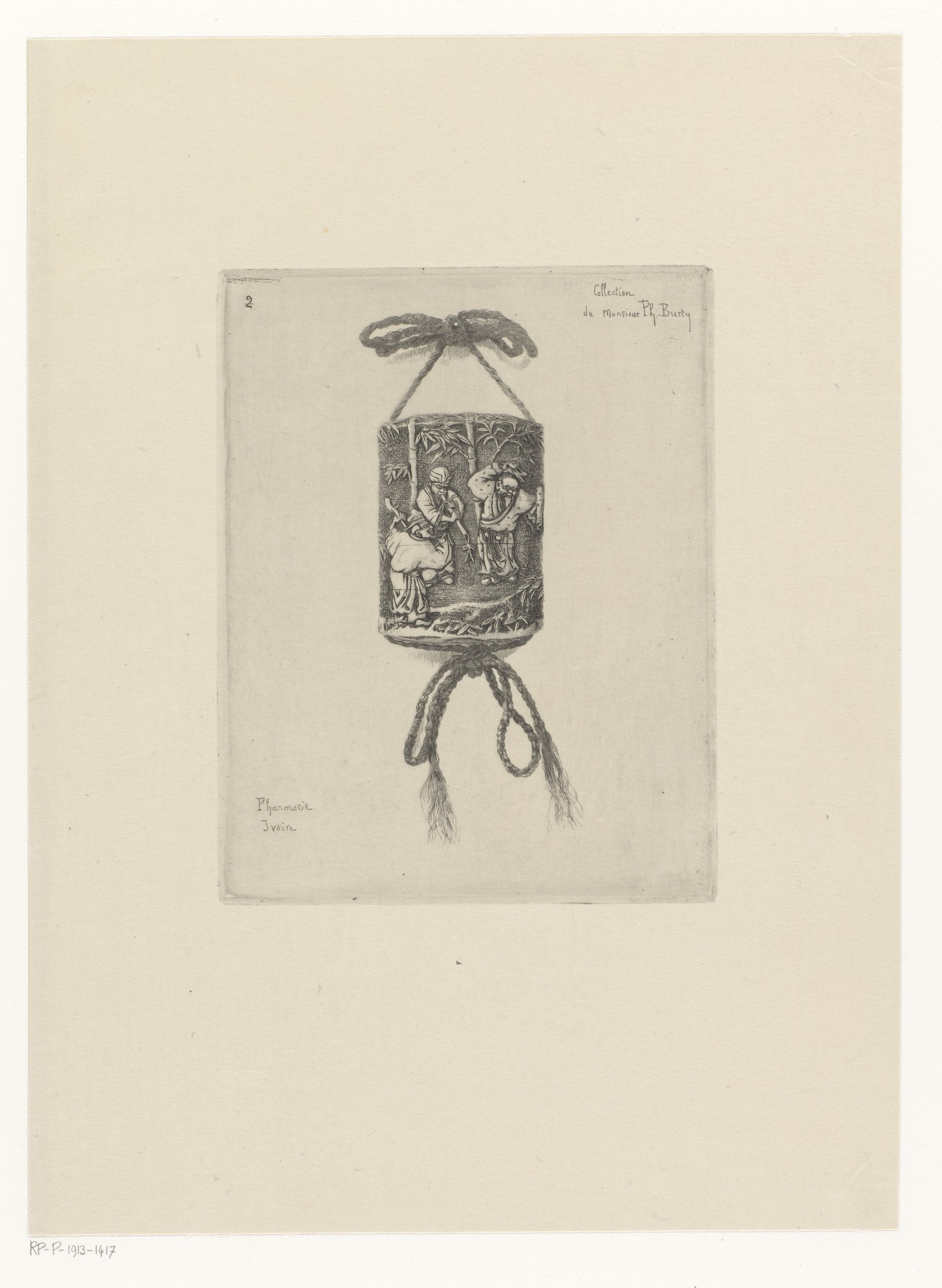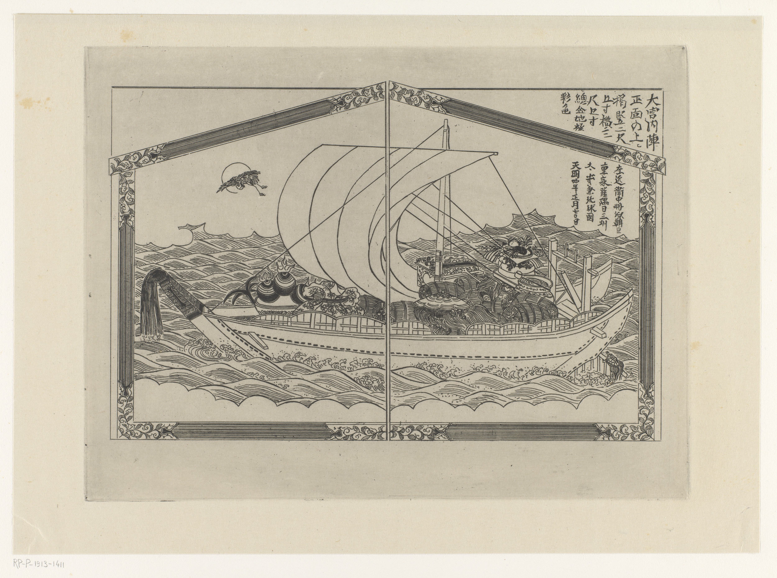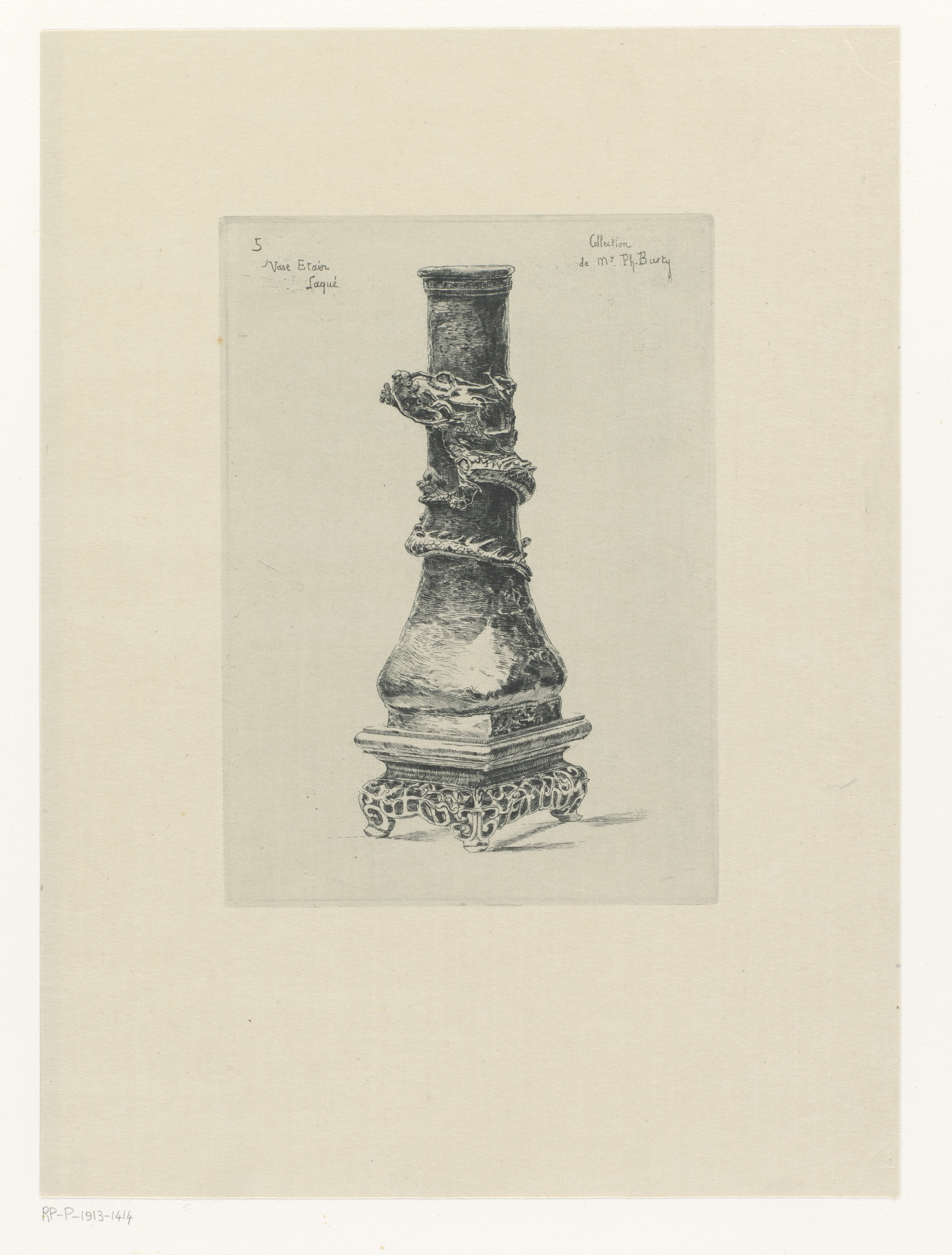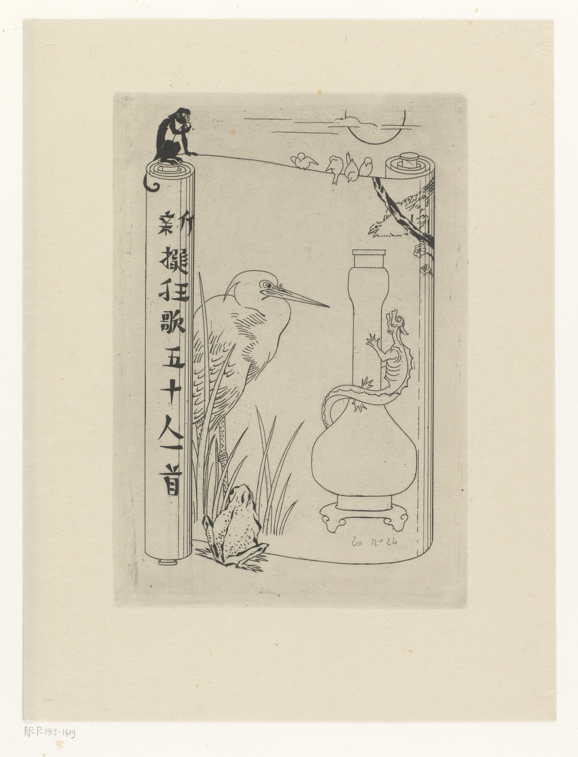 Boekrol met daarop een kraanvogel, vaas met hagedis ...
