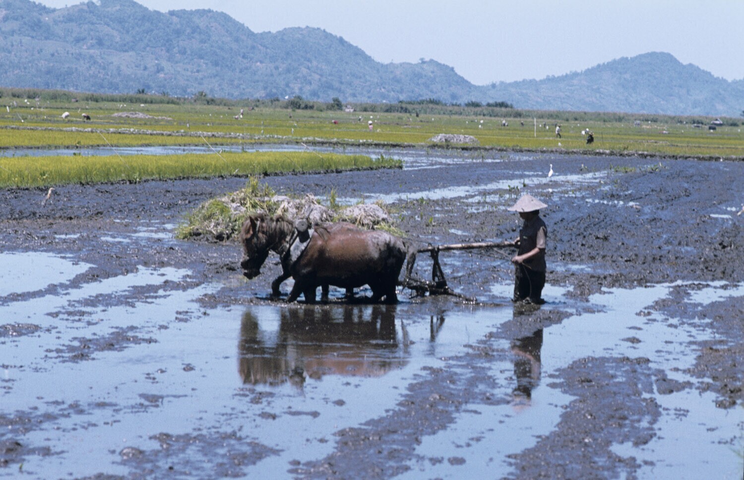 Rijstvelden waar mensen aan het ploegen en aan het u...
