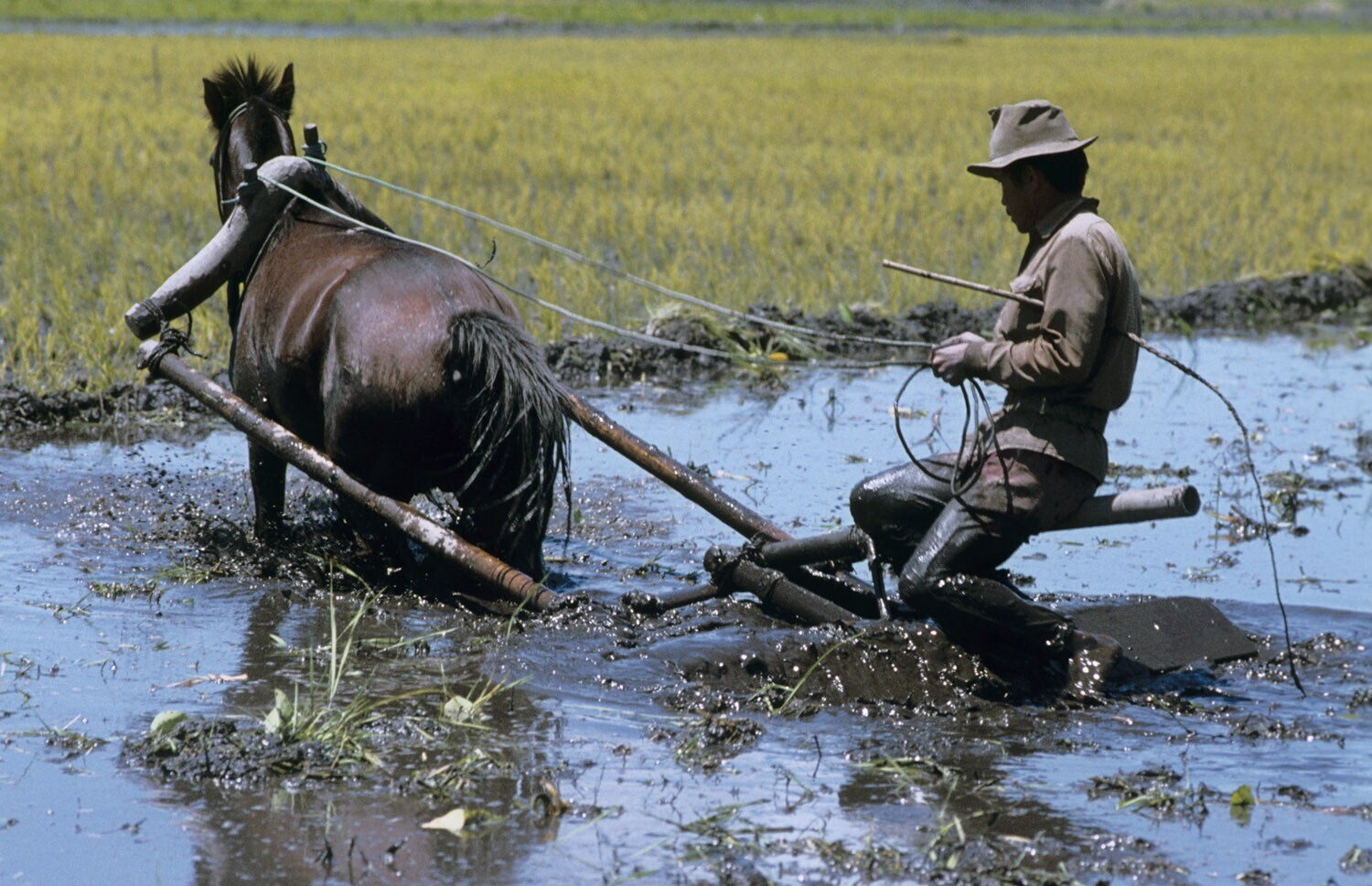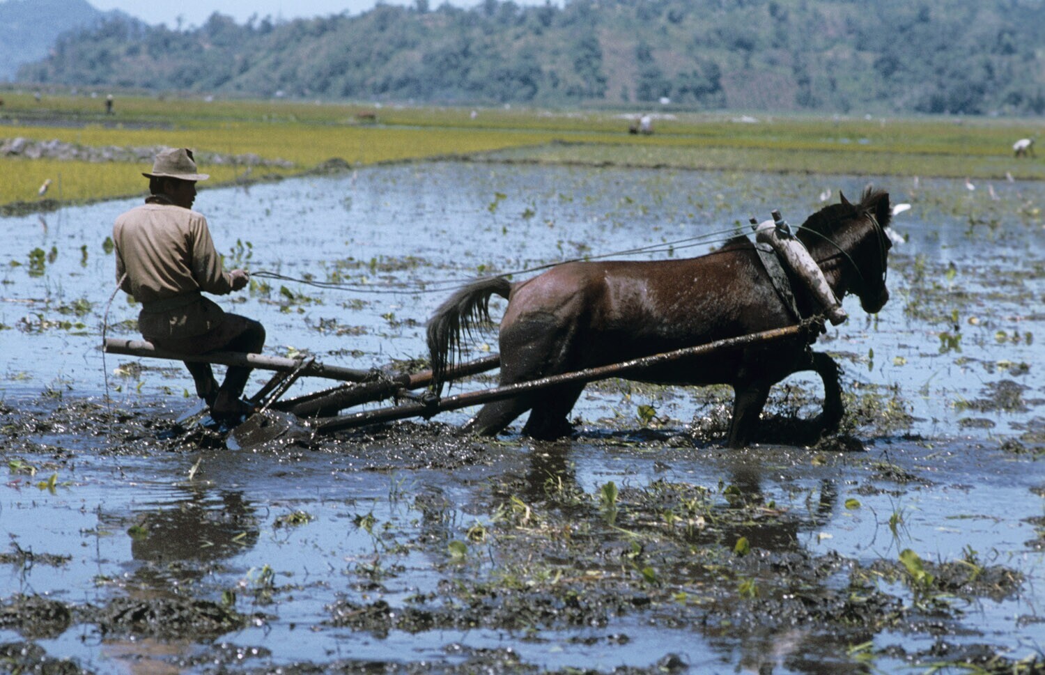 Het ploegen van een sawah met een paard, Tondano, Su...