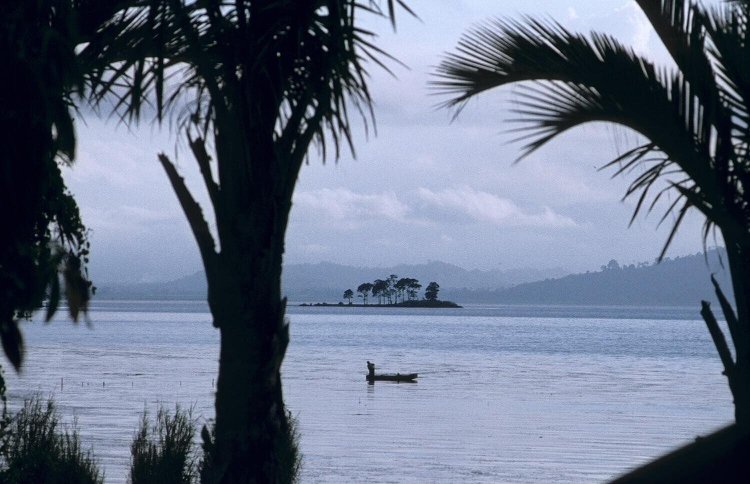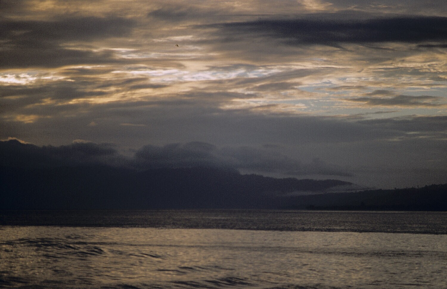 Gezicht vanaf het water van Tulehu op Ambon, Molukken.
