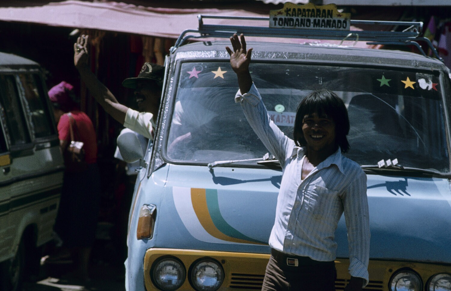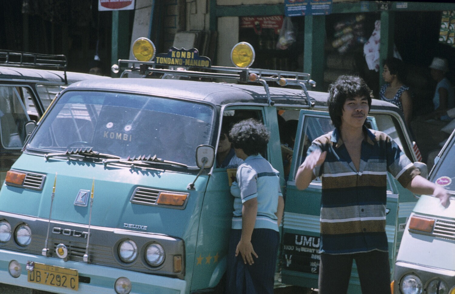 Straatbeeld met Colt-busjes in Tondano, Sulawesi.