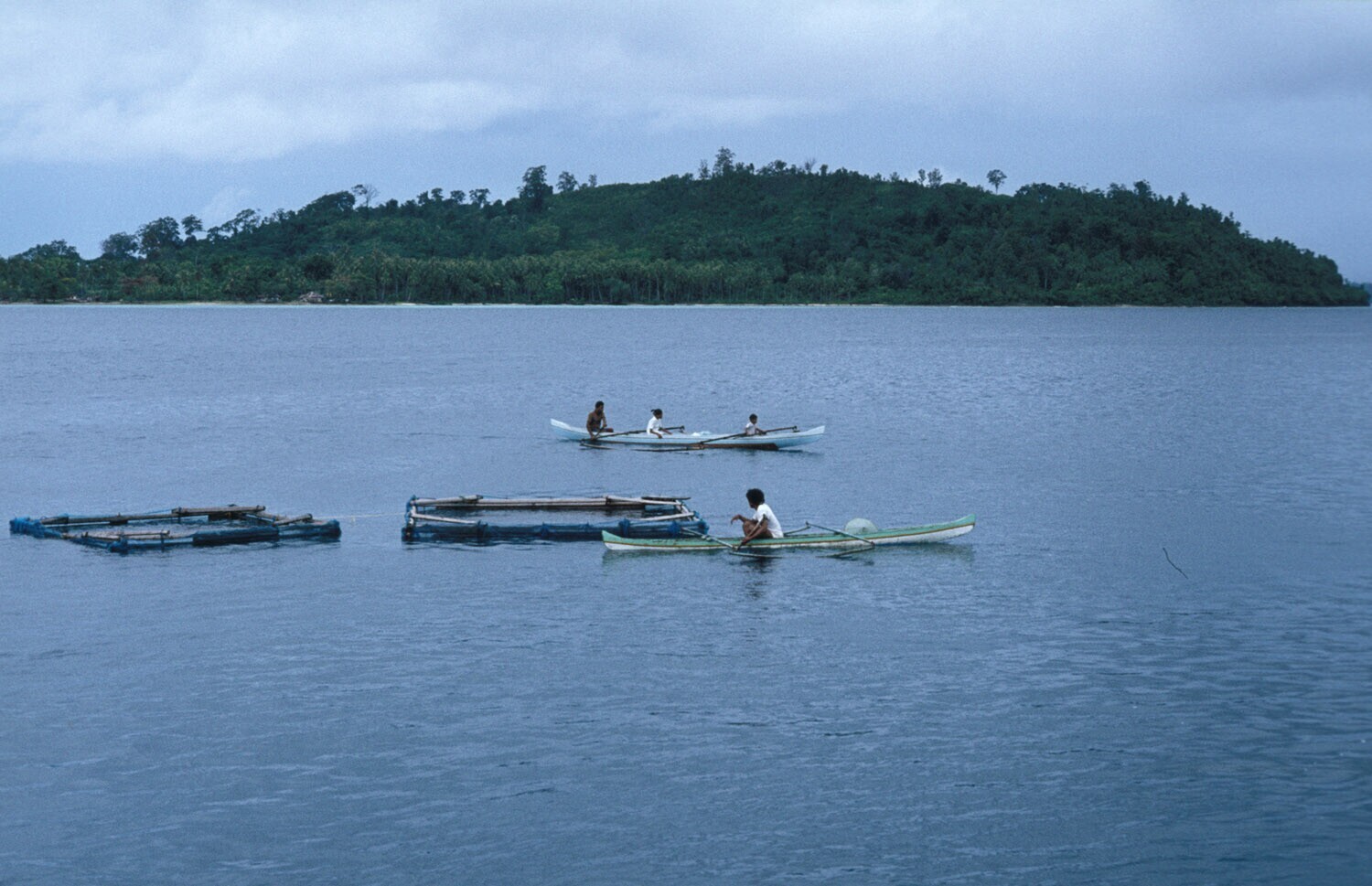 Drijvende akers met voorraden aasvisjes voor de kust...