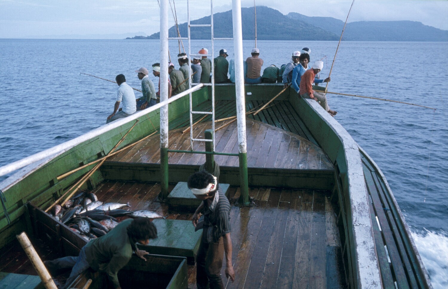 'De vissers van een tonijnvisser in actie; de tonijn...