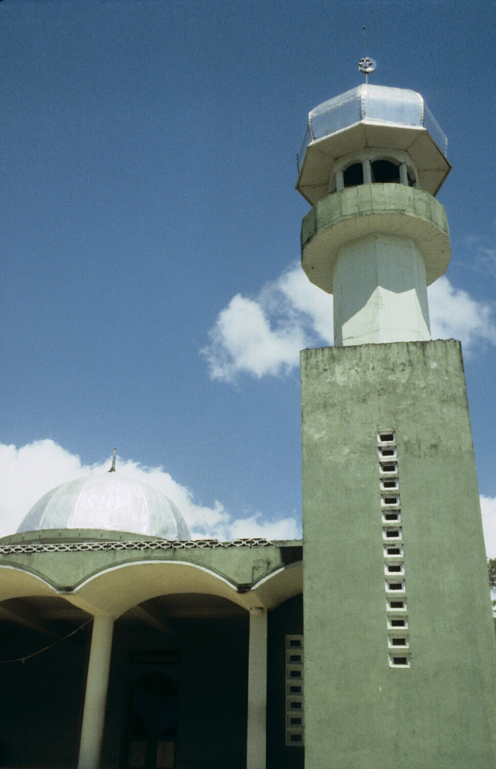 De toren van de moskee van Tulehu op Ambon, Molukken.