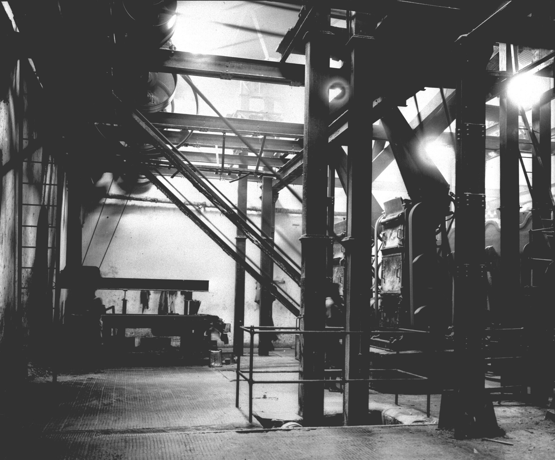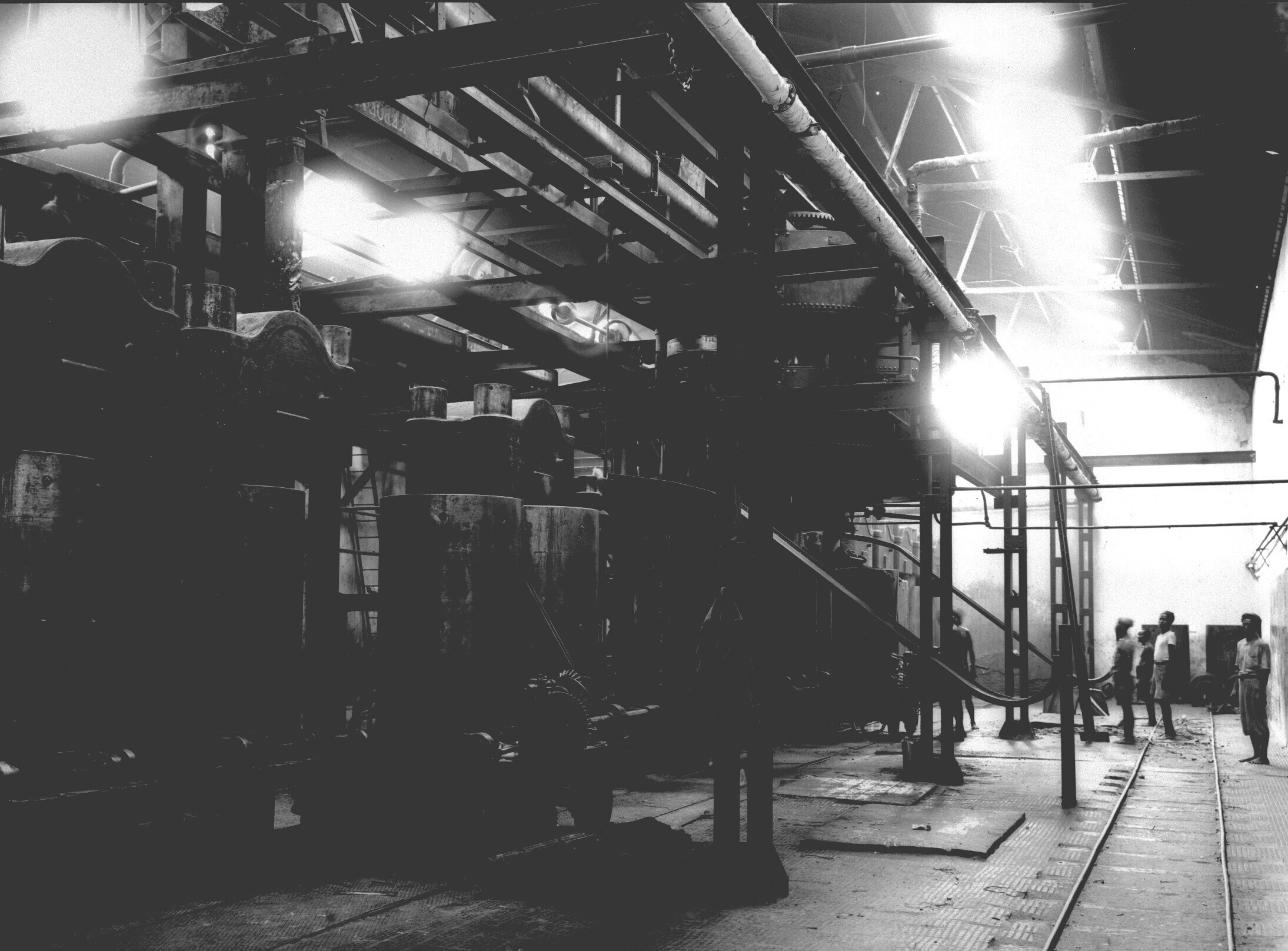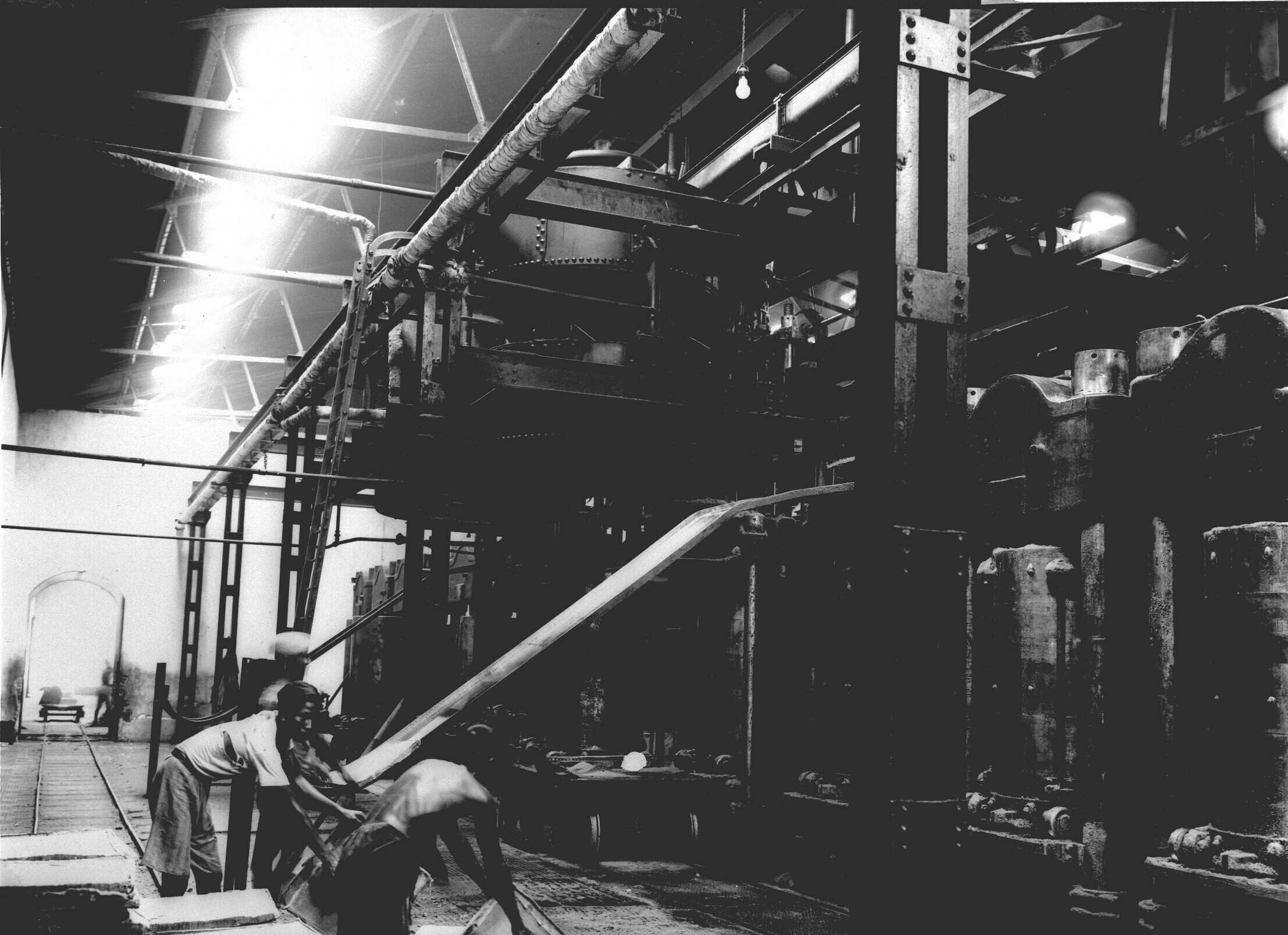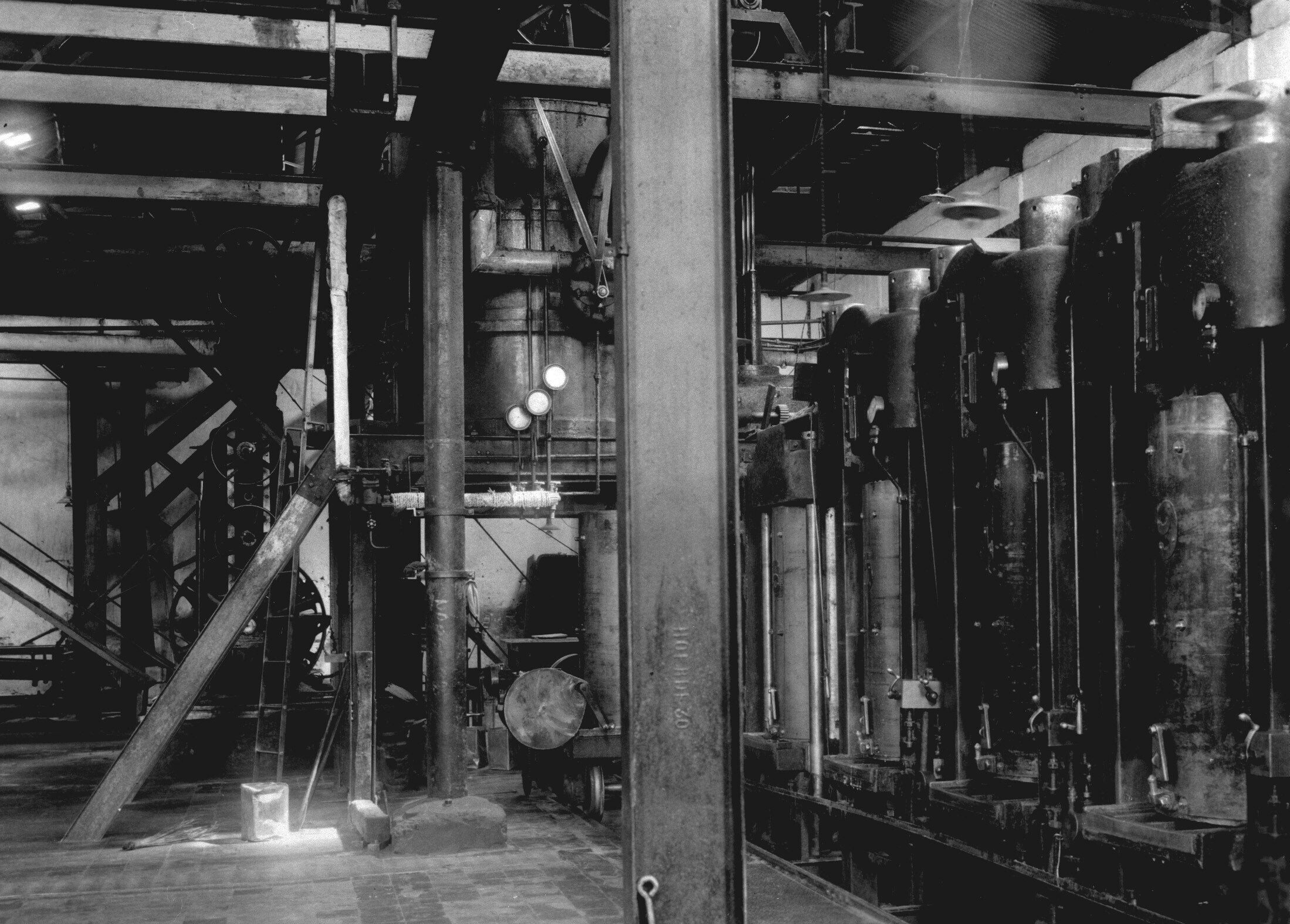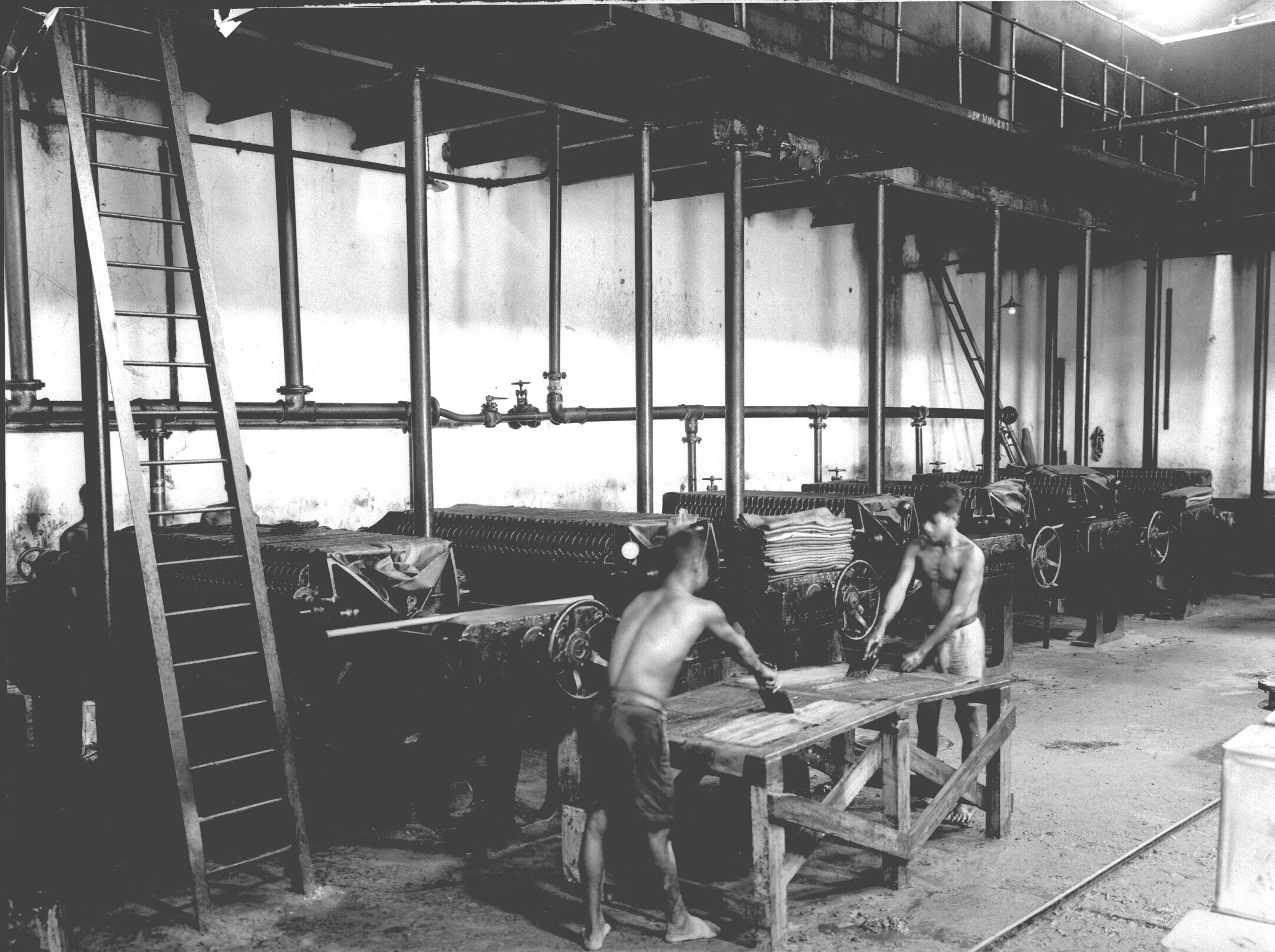Mannen bij de persenbatterij in de Mexolie Fabrieken...