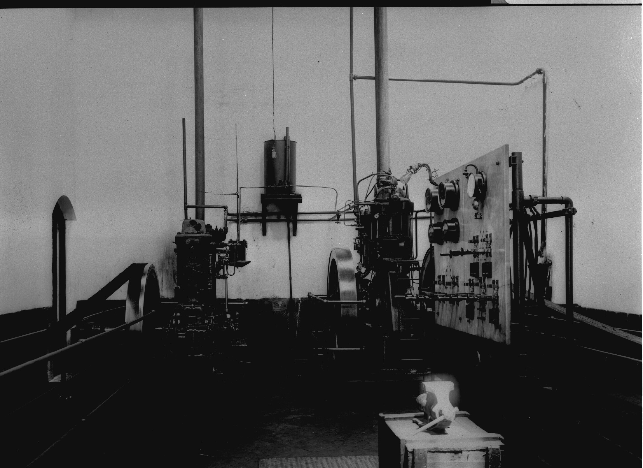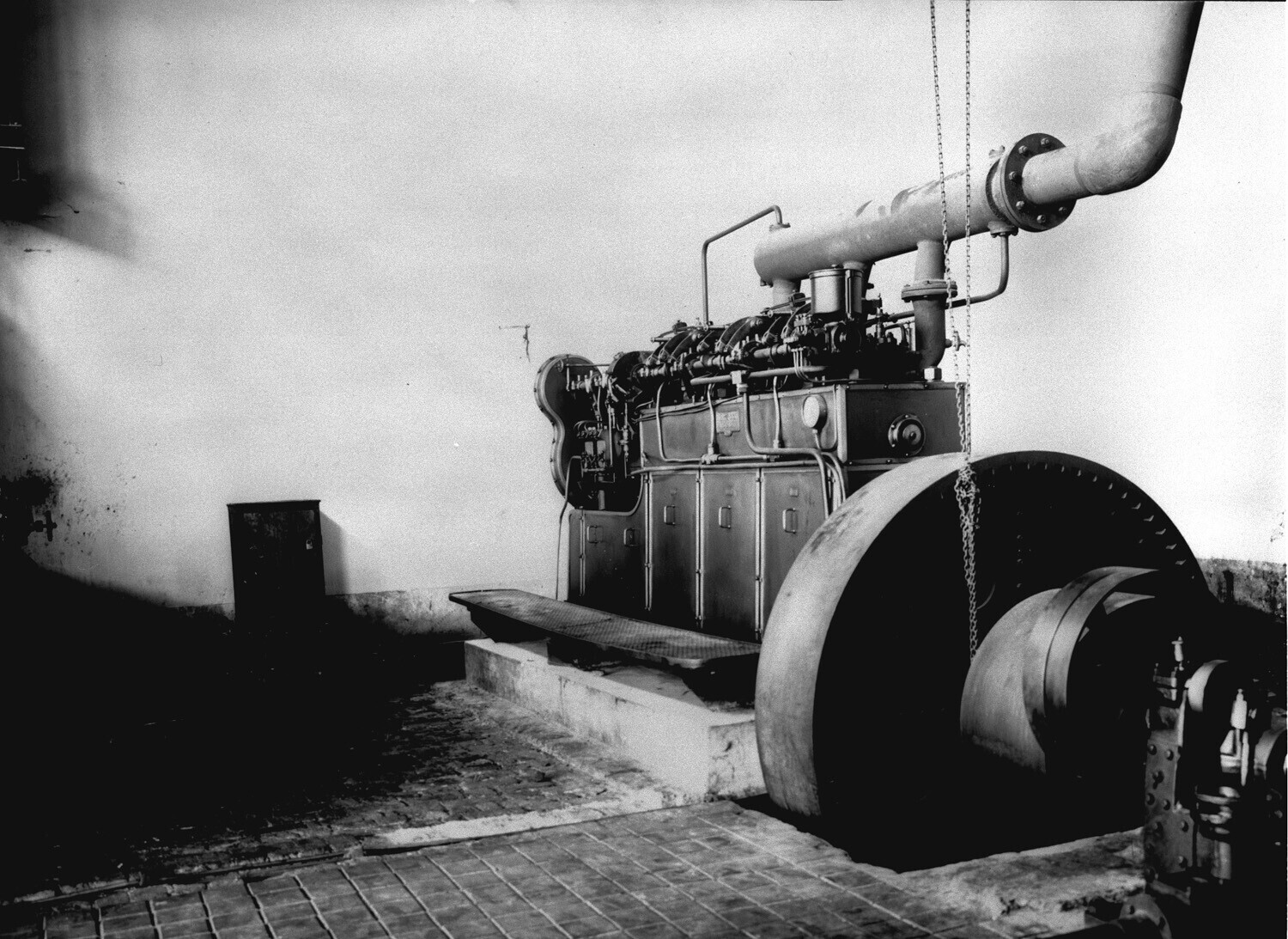 Twee mannen bij een dieselmotor van de Mexolie Fabri...