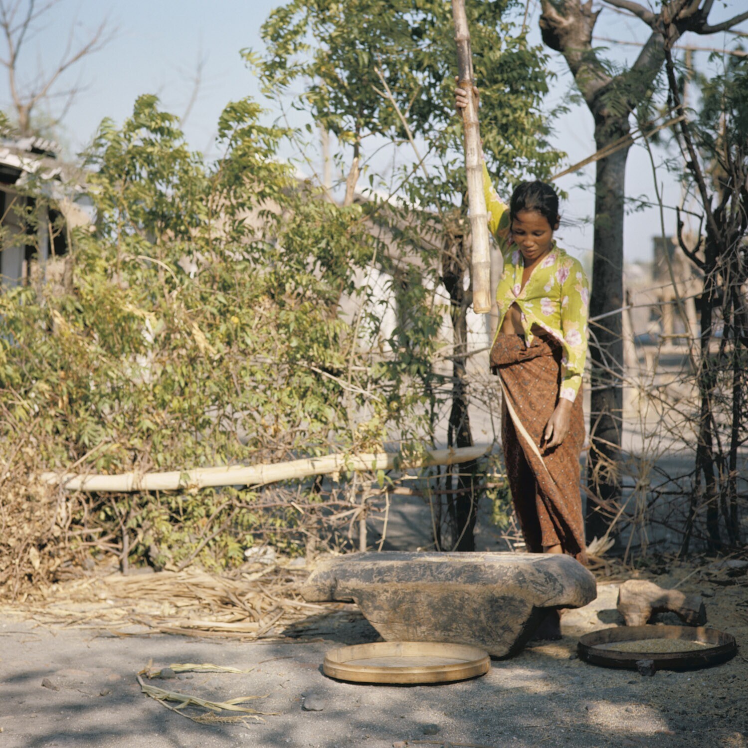 Vrouw bezig met het stampen van rijst