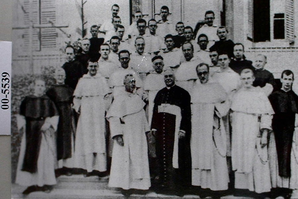 De paters Dominicanen op het trappen bordes bij hun ...