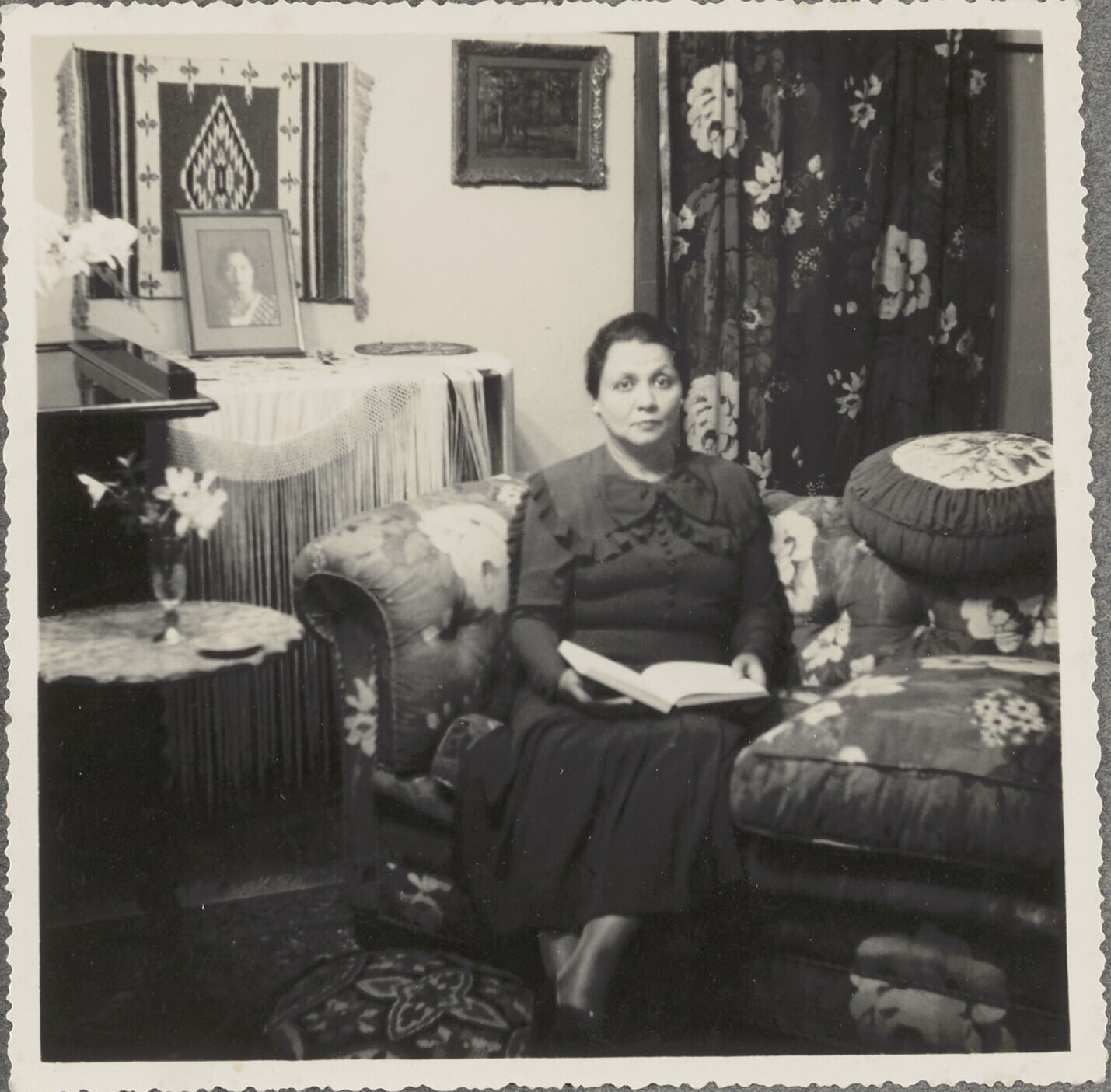 Een vrouw poseert in de zitkamer met een boek in haa...