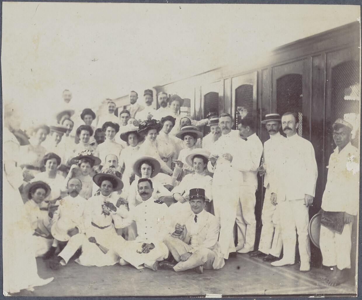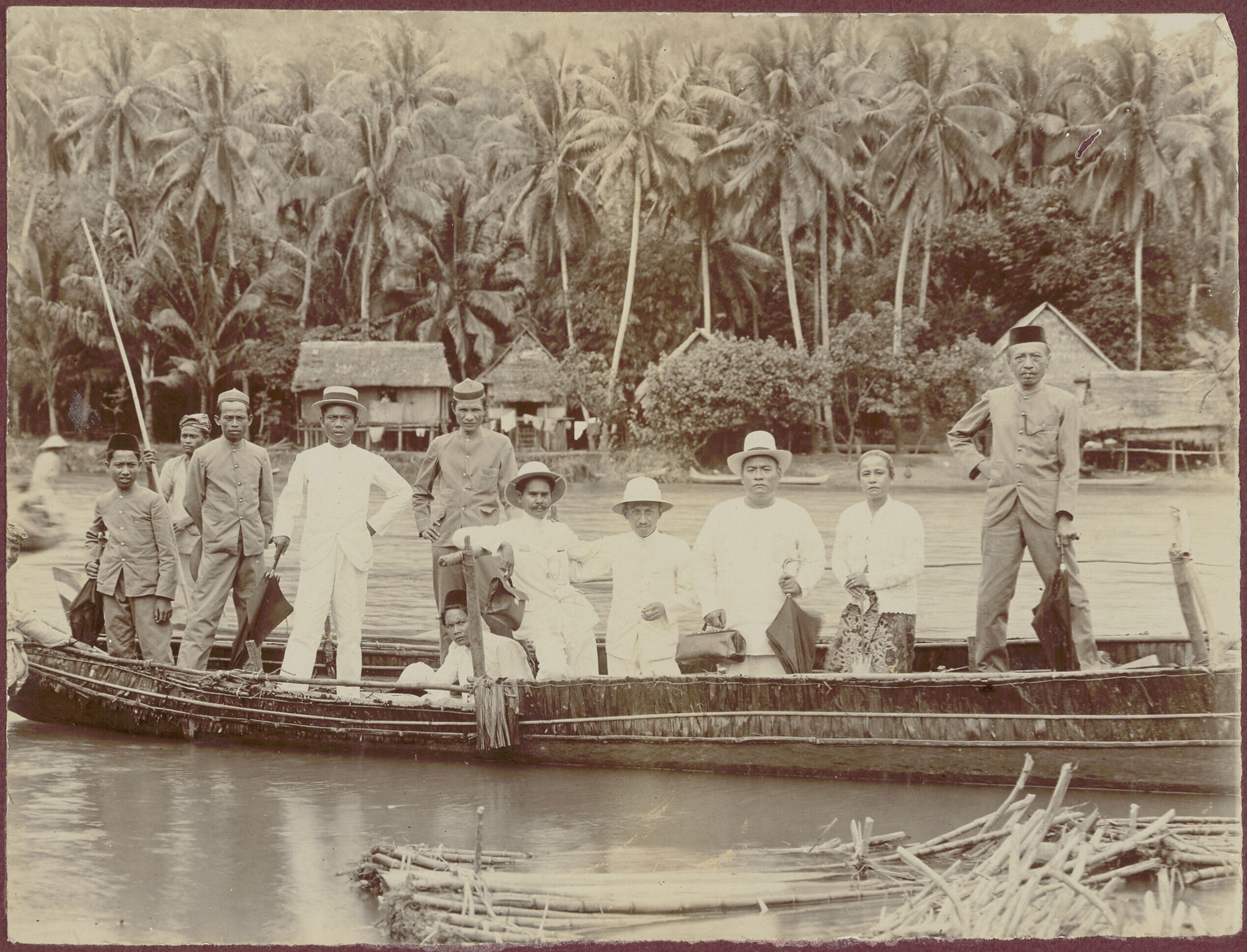 Groepsportret van ambtenaren en hun gevolg op een prauw