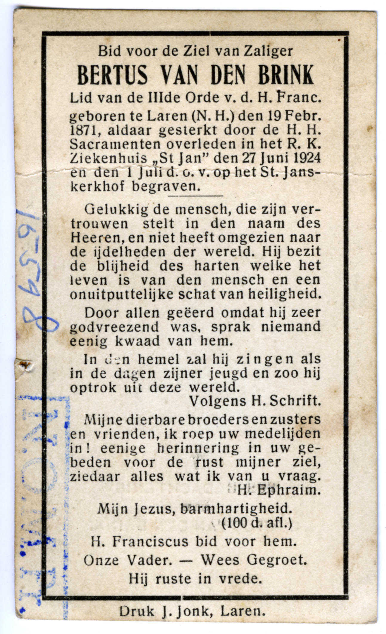 Bidprentje van Bertus van den Brink, 1924