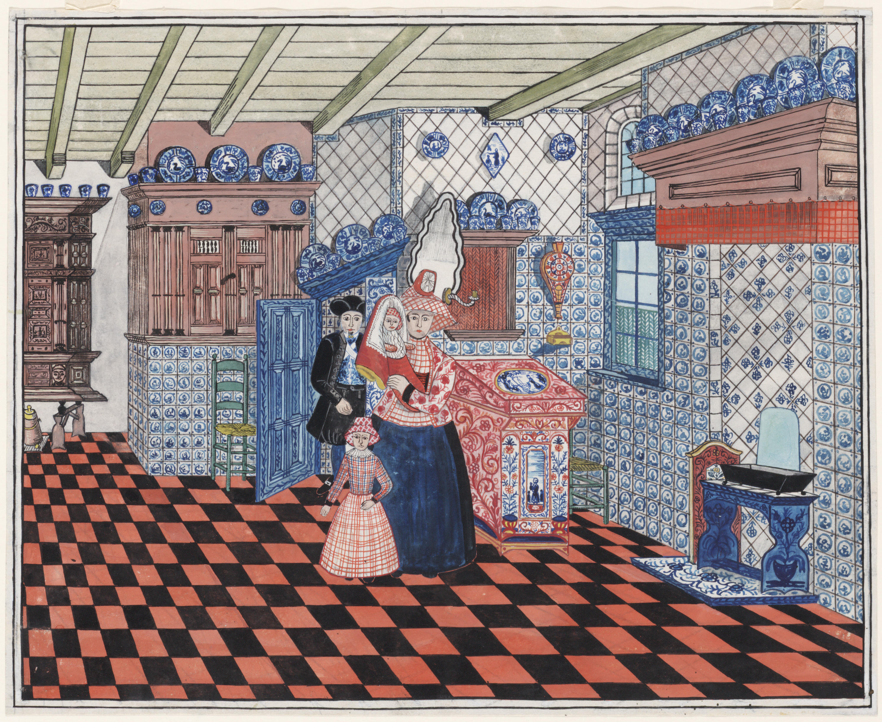 Man, vrouw en kinderen in Hindelooper interieur