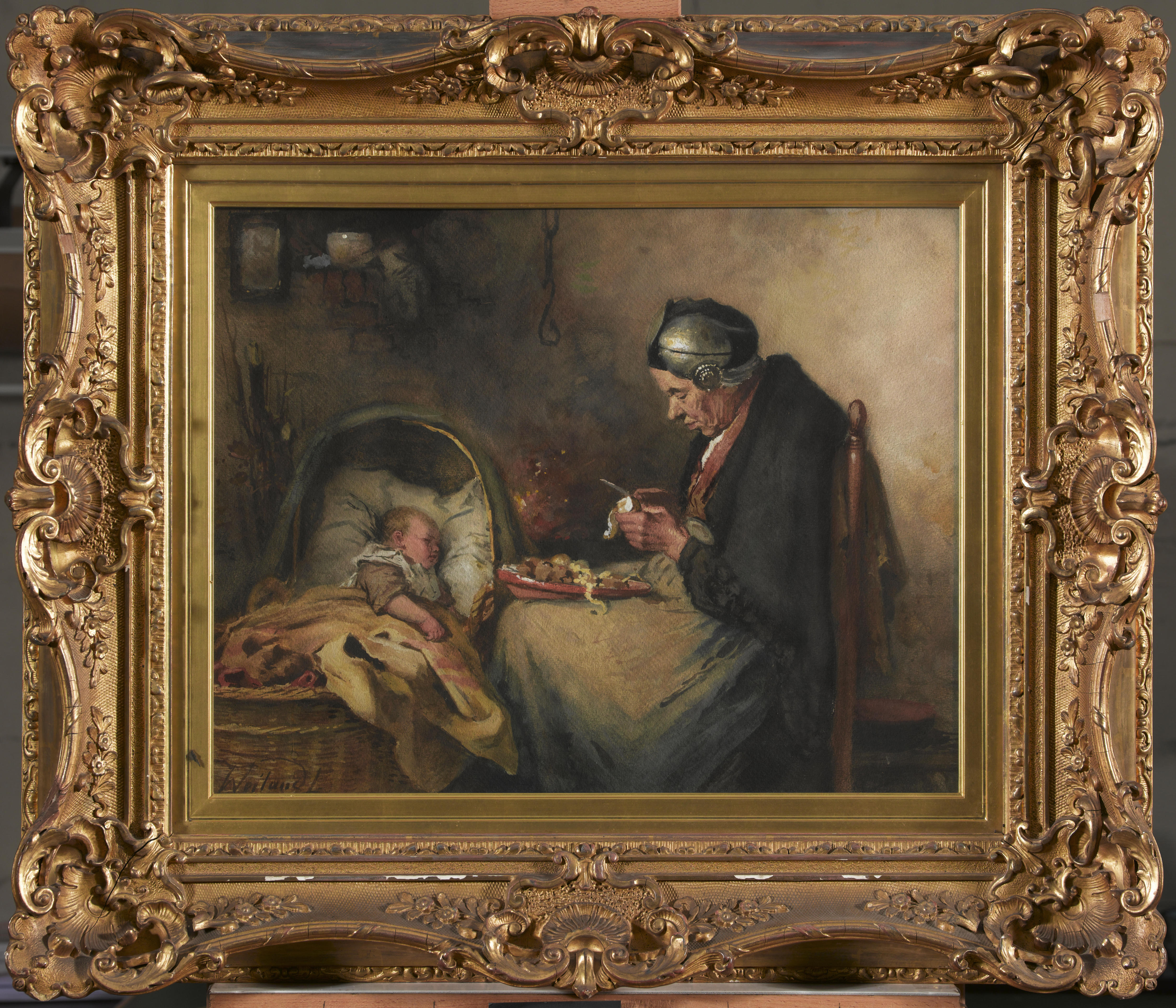Aquarel van Friese vrouw bij kind in wieg, 1910–1920