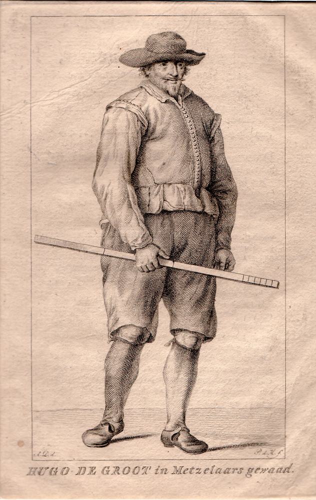 Hugo de Groot ten voeten uit, gekleed als metselaars...