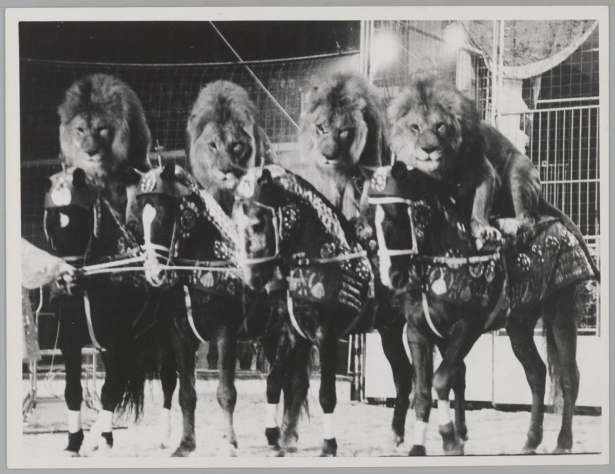 Staatscircus van Moskou. 4 leeuwen als ruiters, gepr...