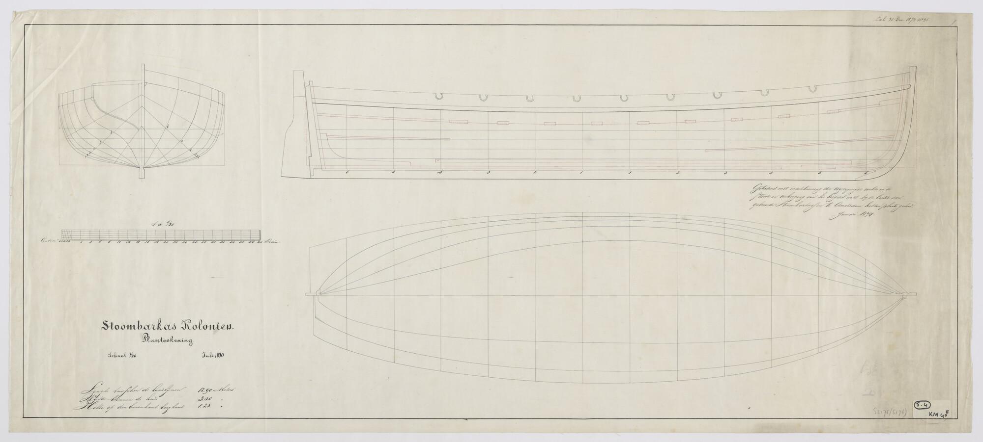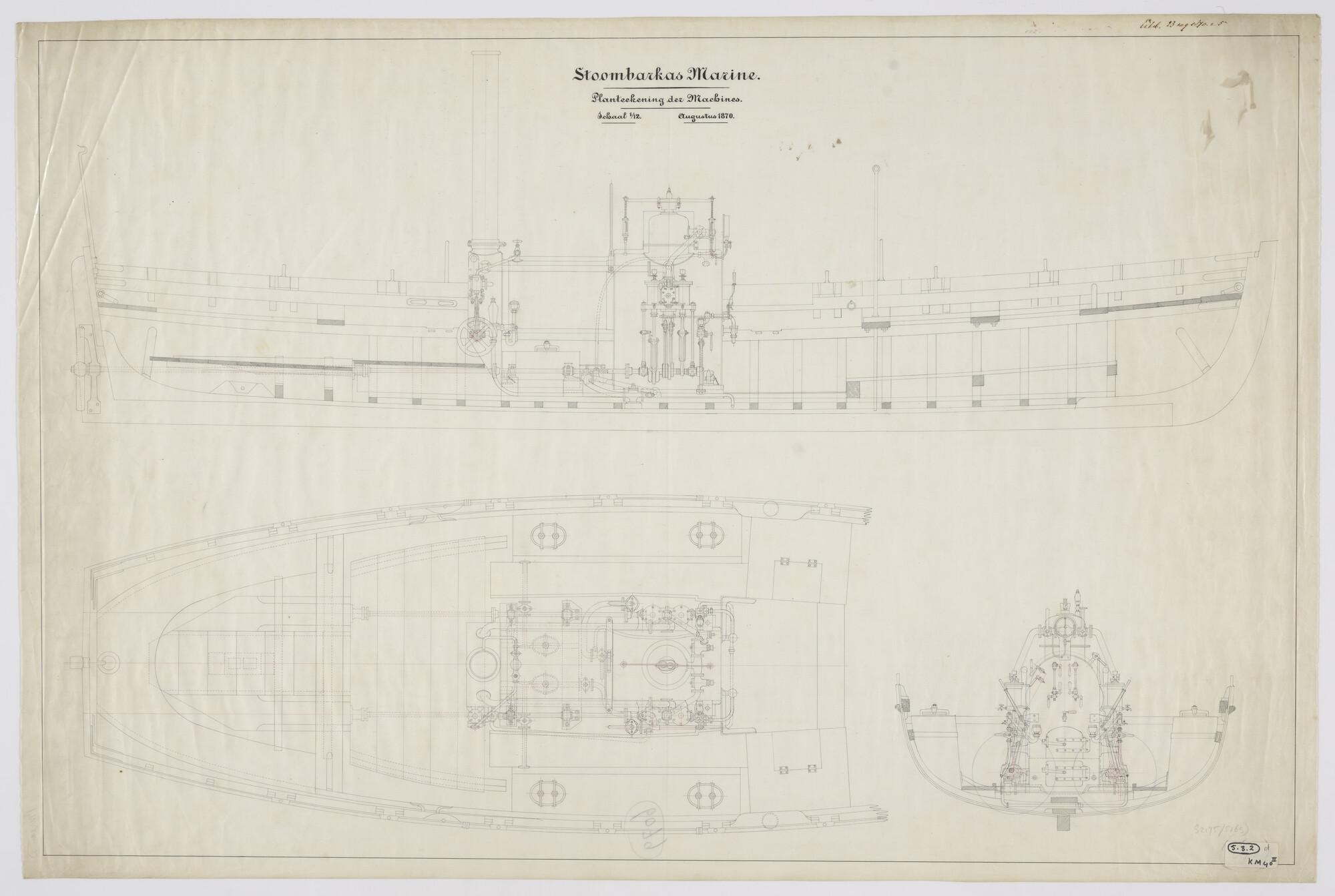 Doorsneden en bovenaanzicht van een stoombarkas met ...