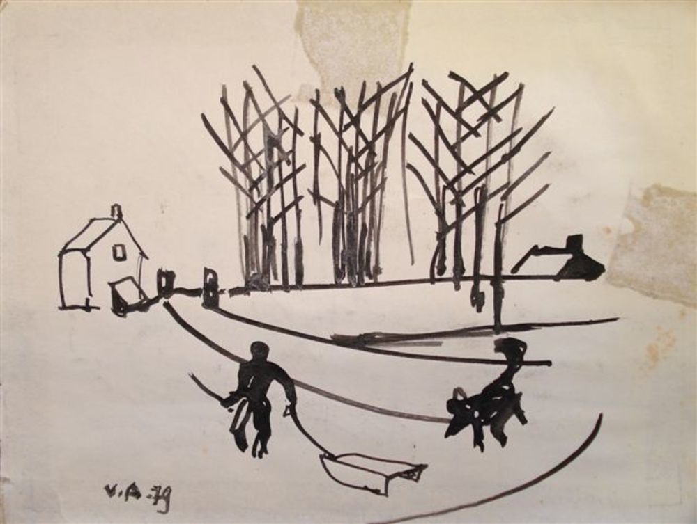 aquarel, man met hond en slee, Jan van Anrooy 1979