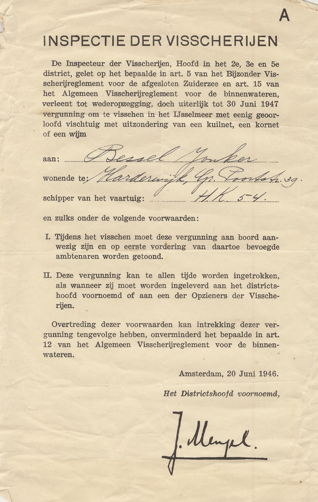 Visvergunning 1947 van Bessel Jonker, schipper van d...