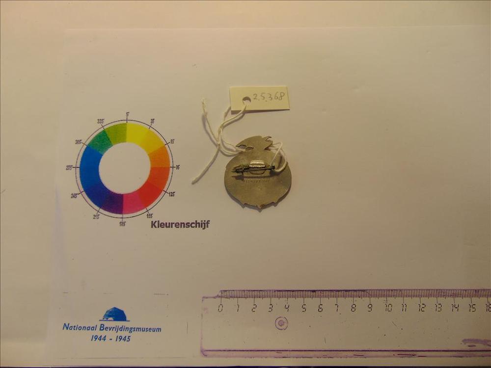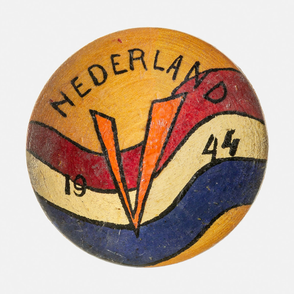 broche, hout, met daarop het V-teken en de tekst Ned...