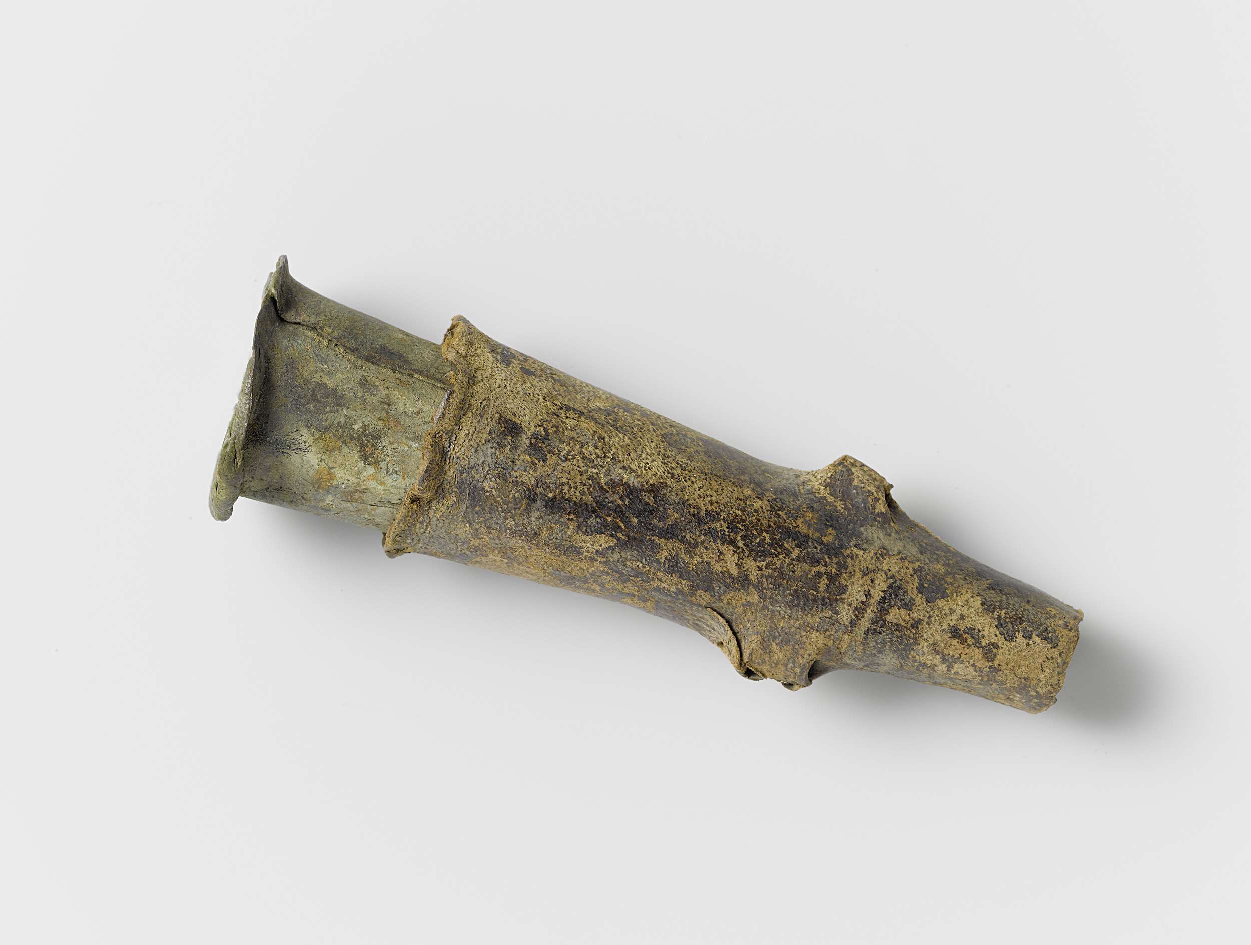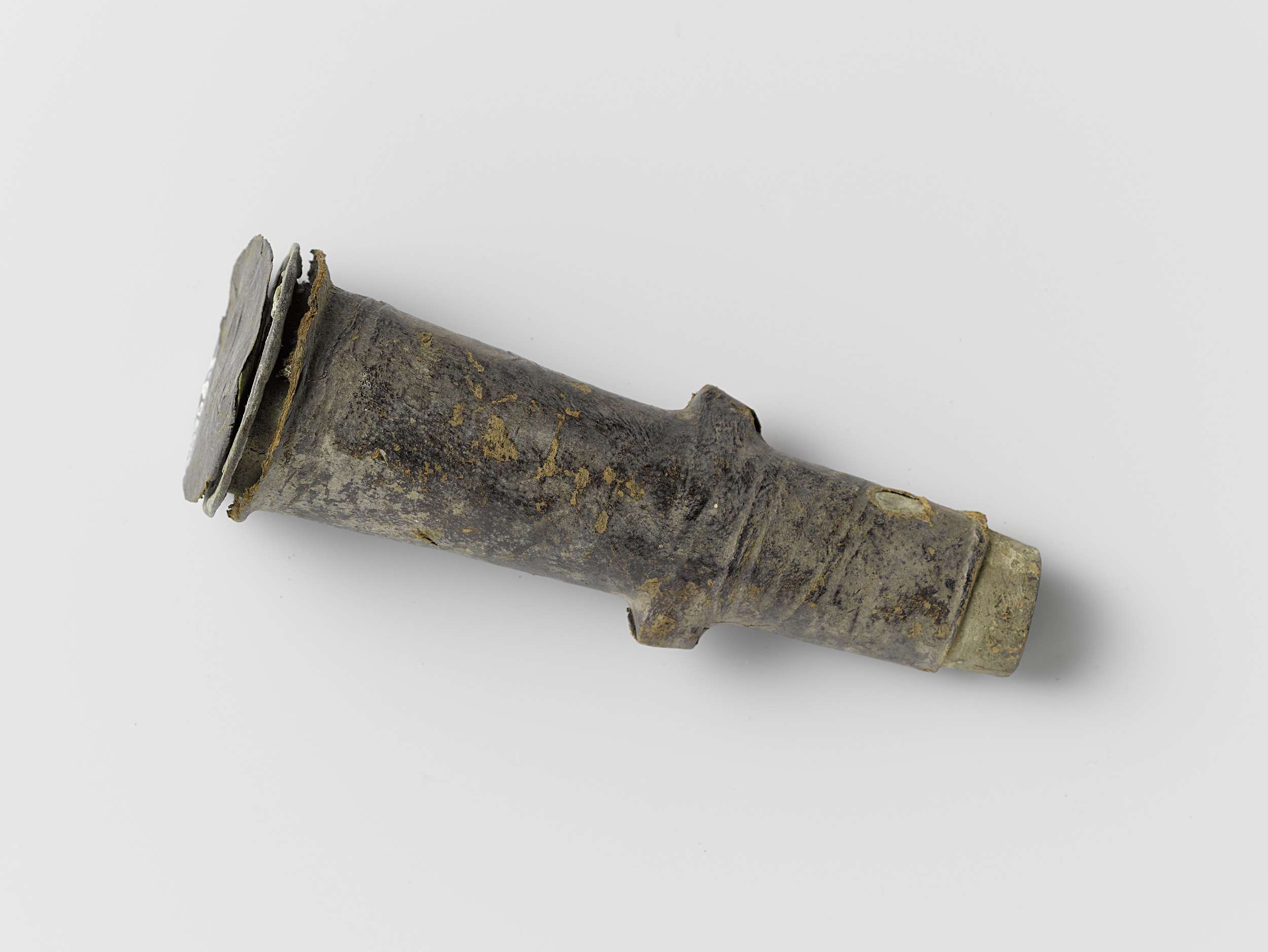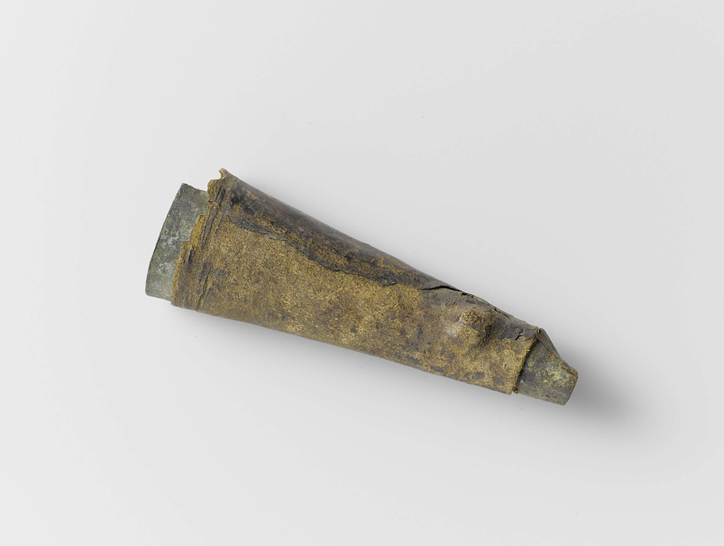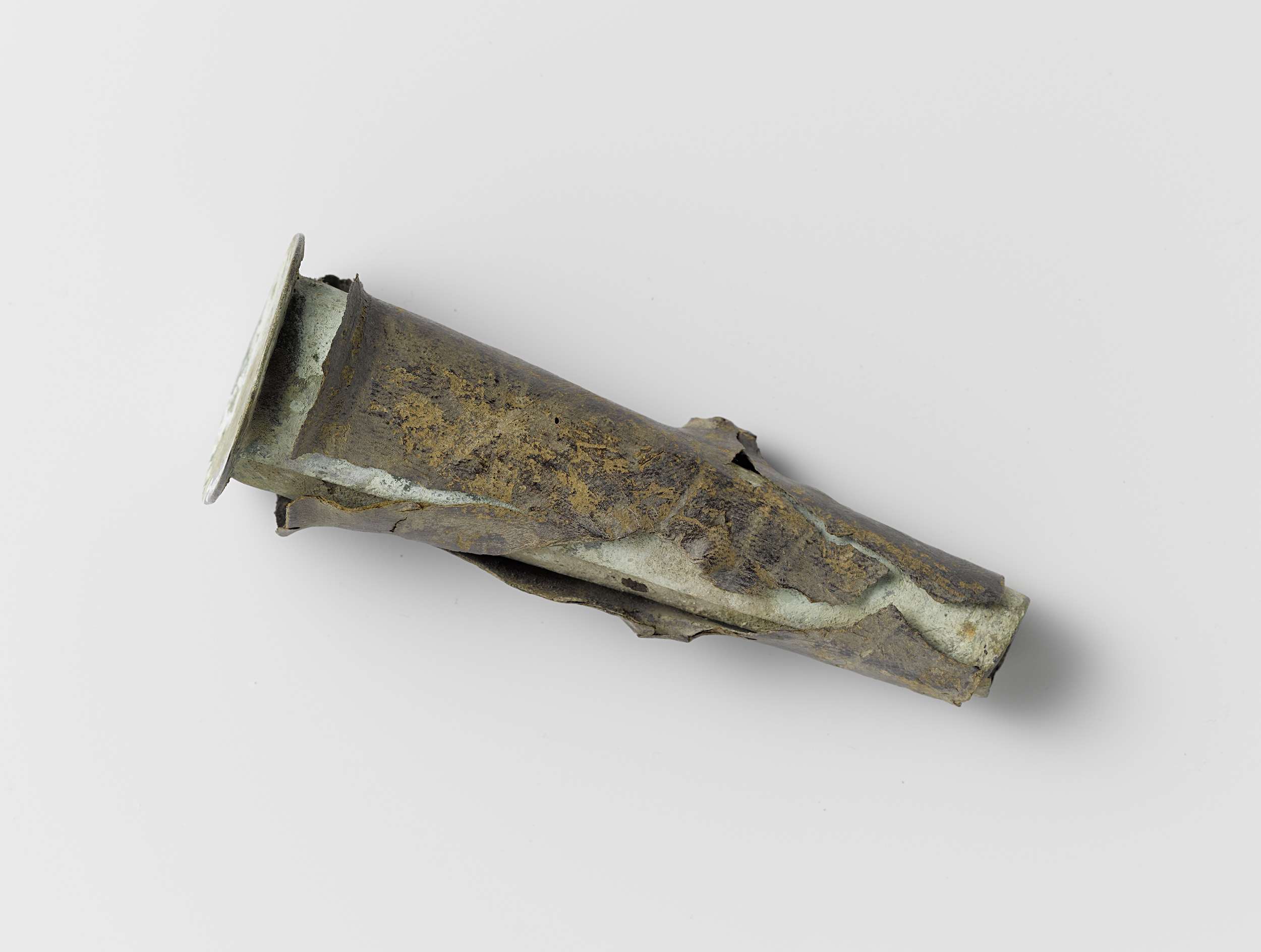Musketmaat, fragment bestaande uit messing huls met ...