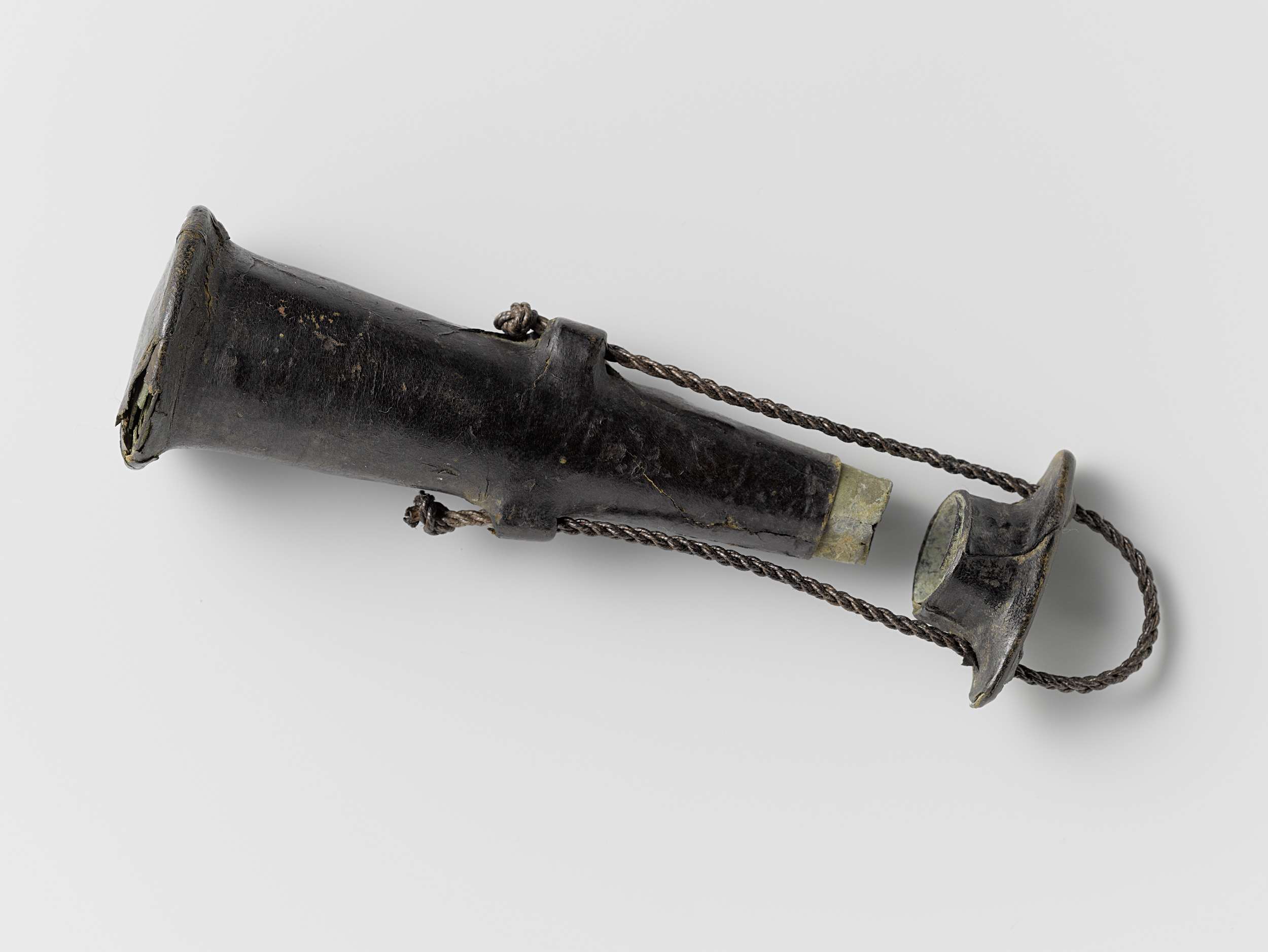 Deksel van een musketmaat van messing met een leren ...