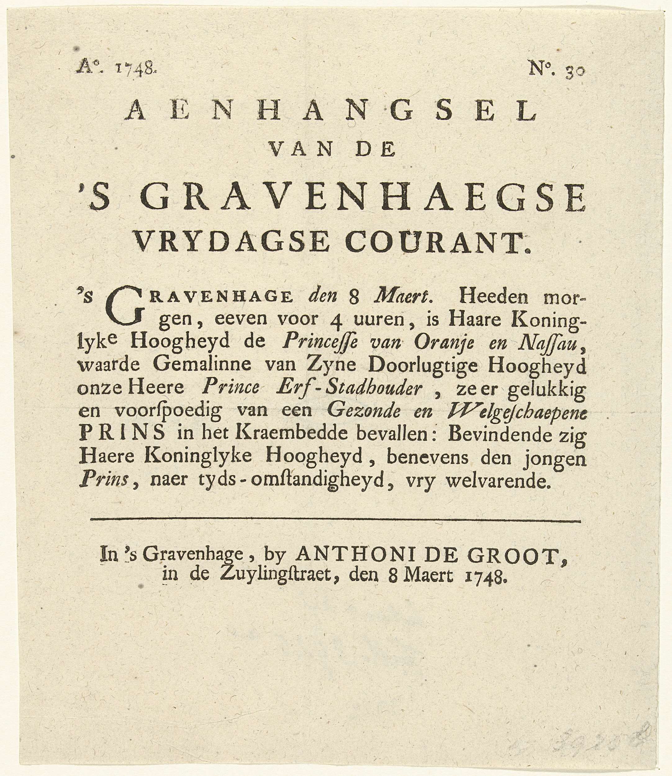 Kennisgeving van de geboorte van prins Willem V, 1748