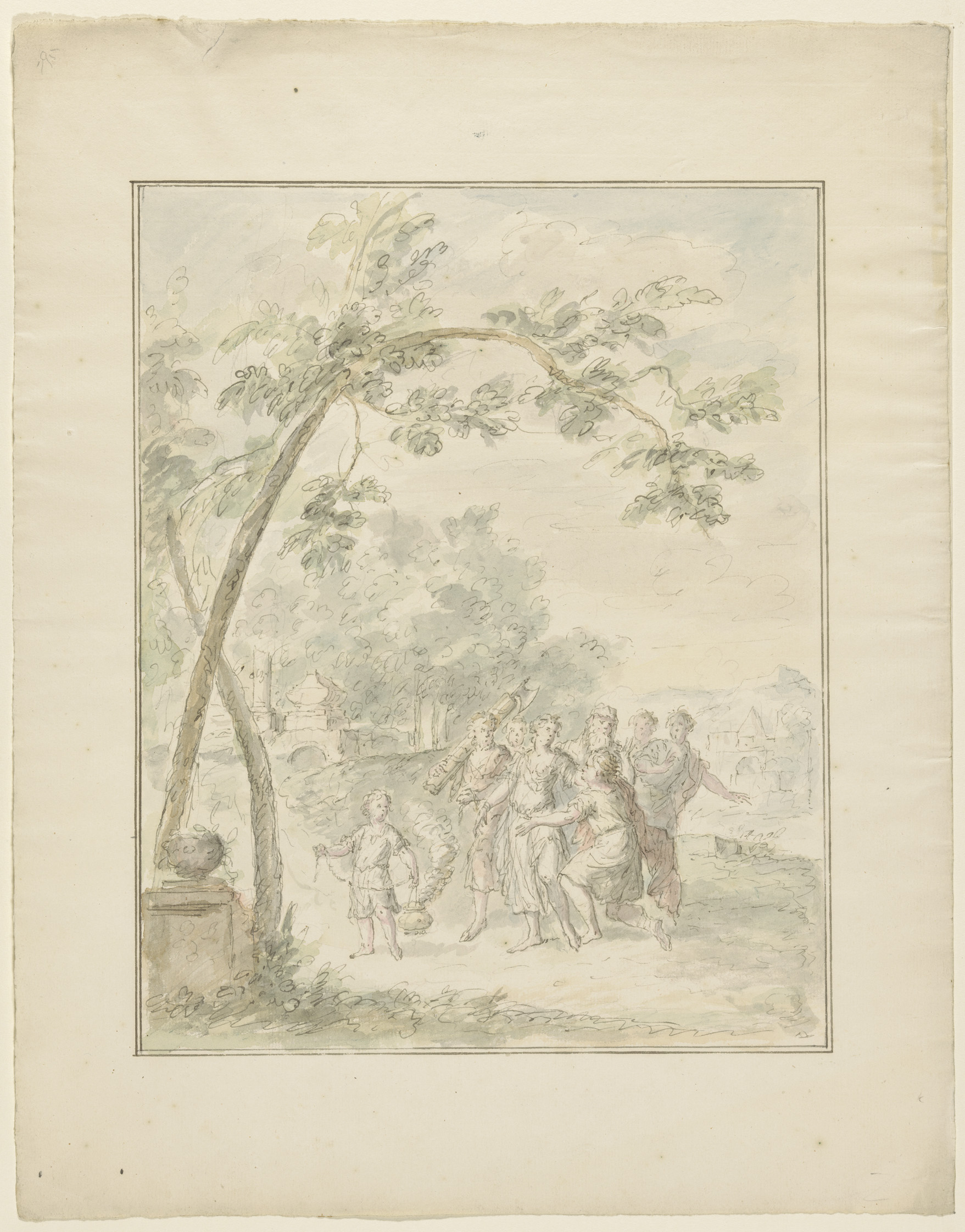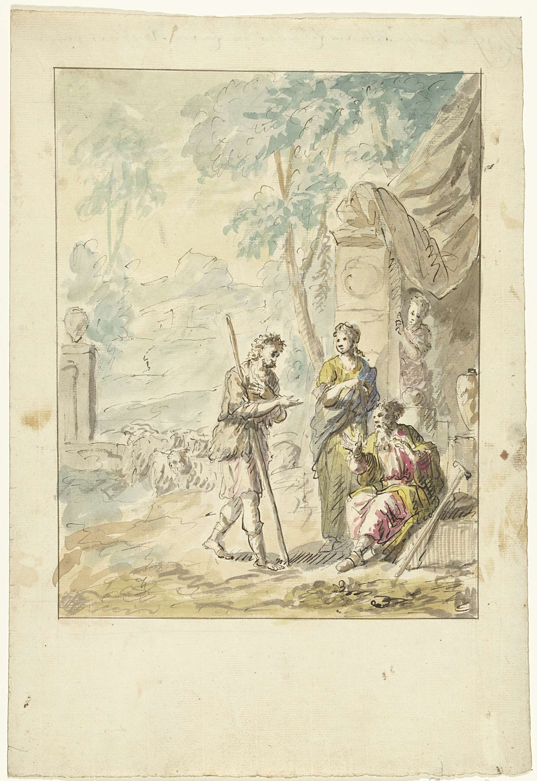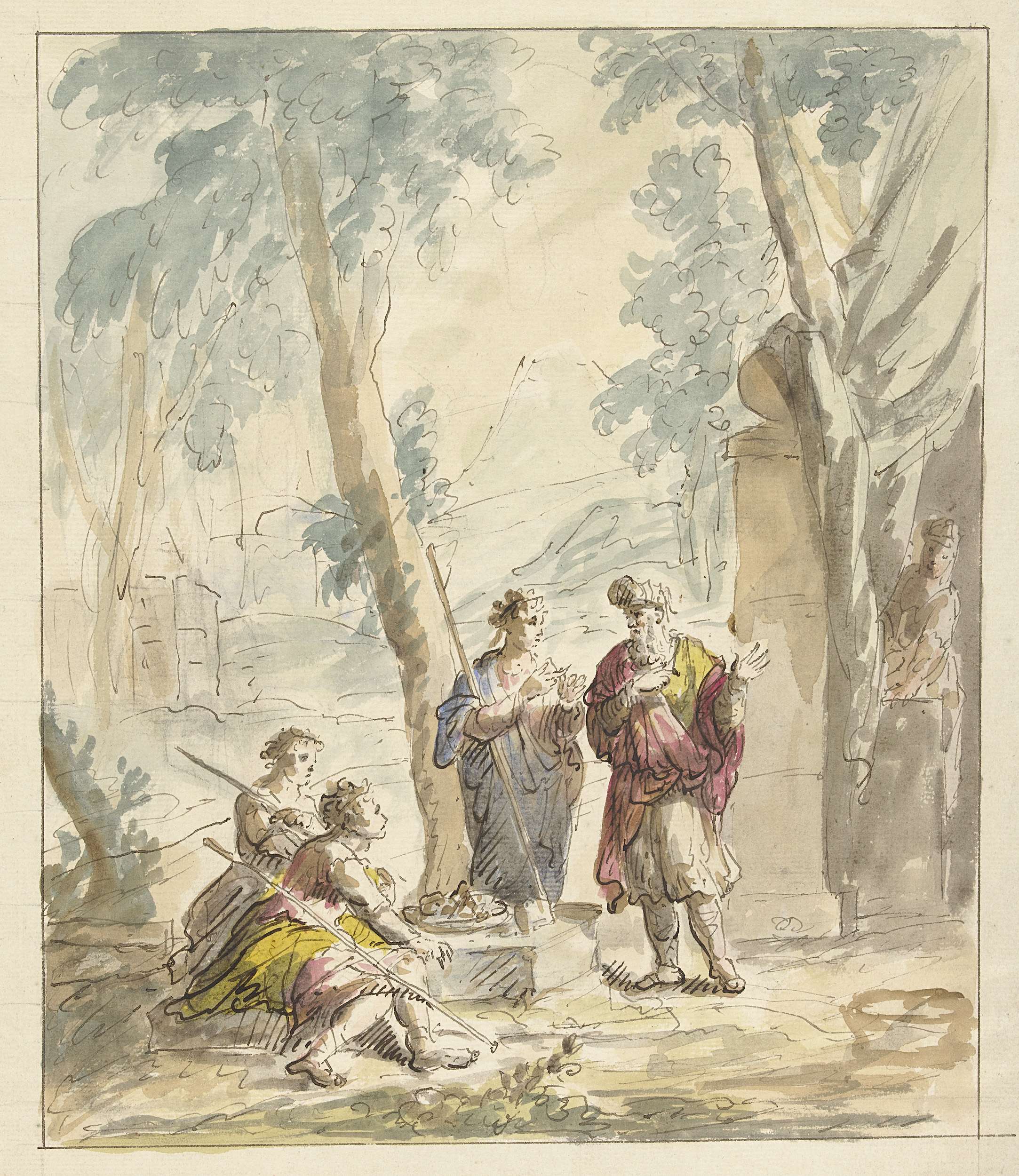 Arcadisch landschap met figuren rond een standbeeld