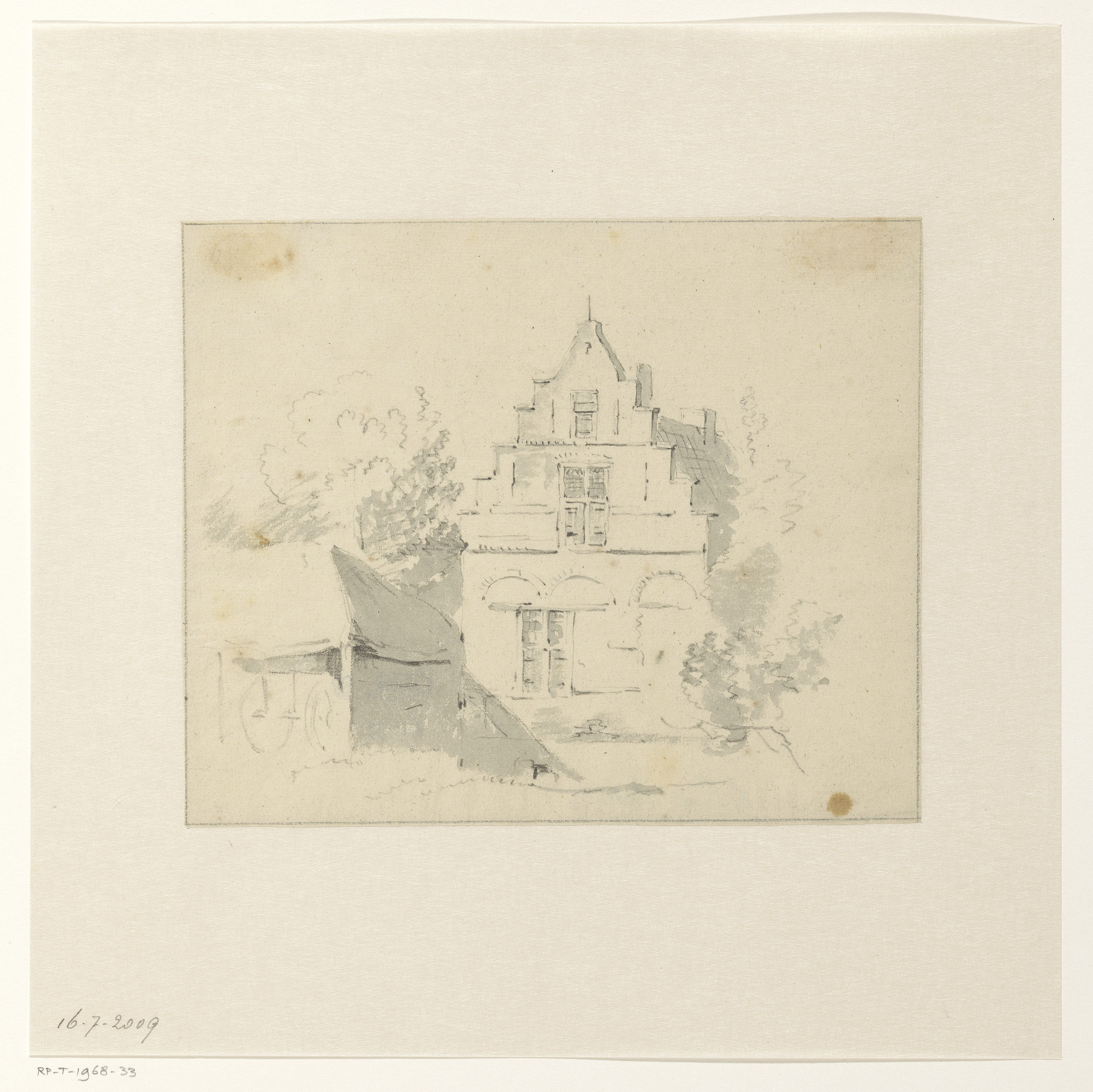 Trapgevel tussen geboomte, bij een boerenschuur