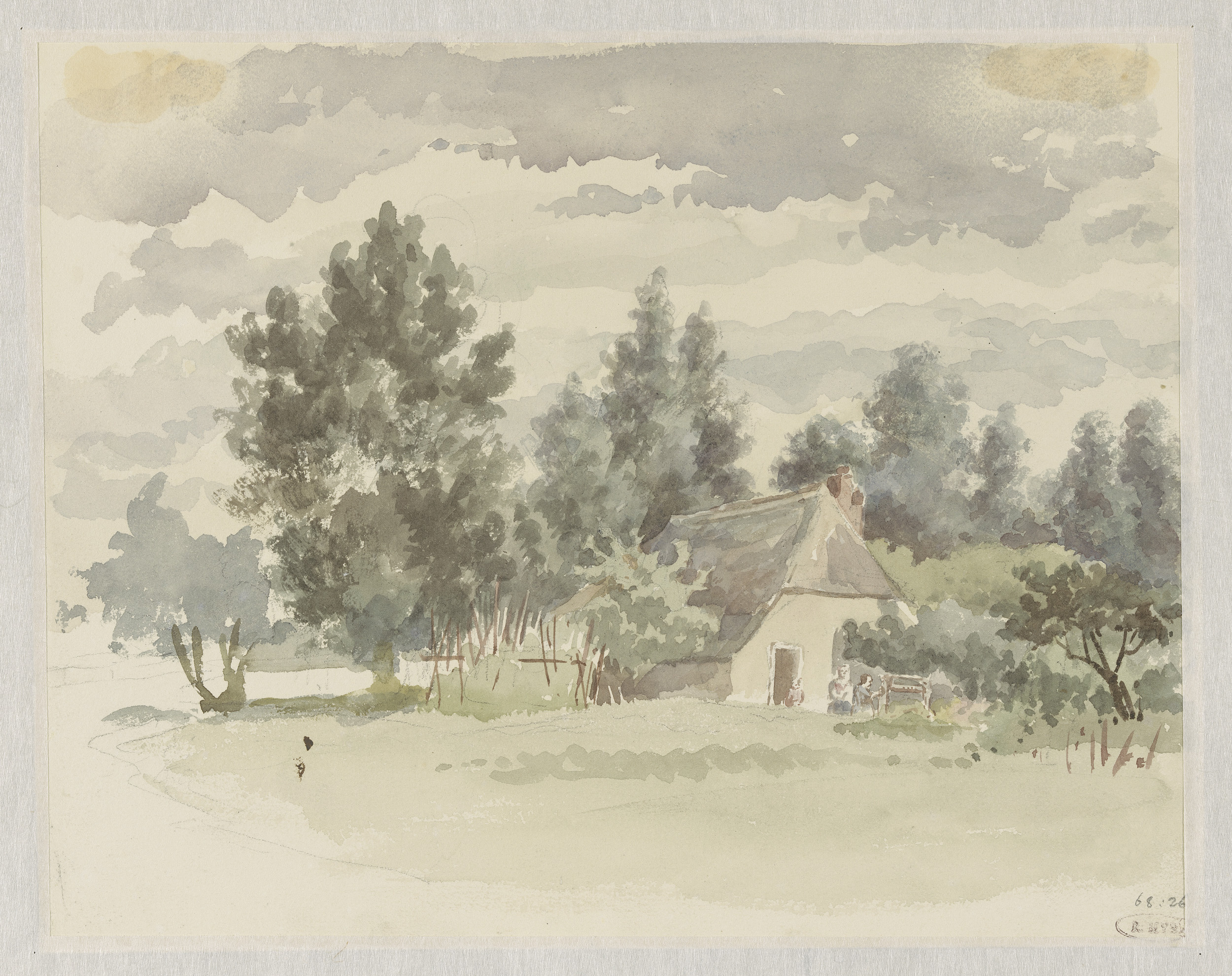Landschap met boerderij omgeven door bomen