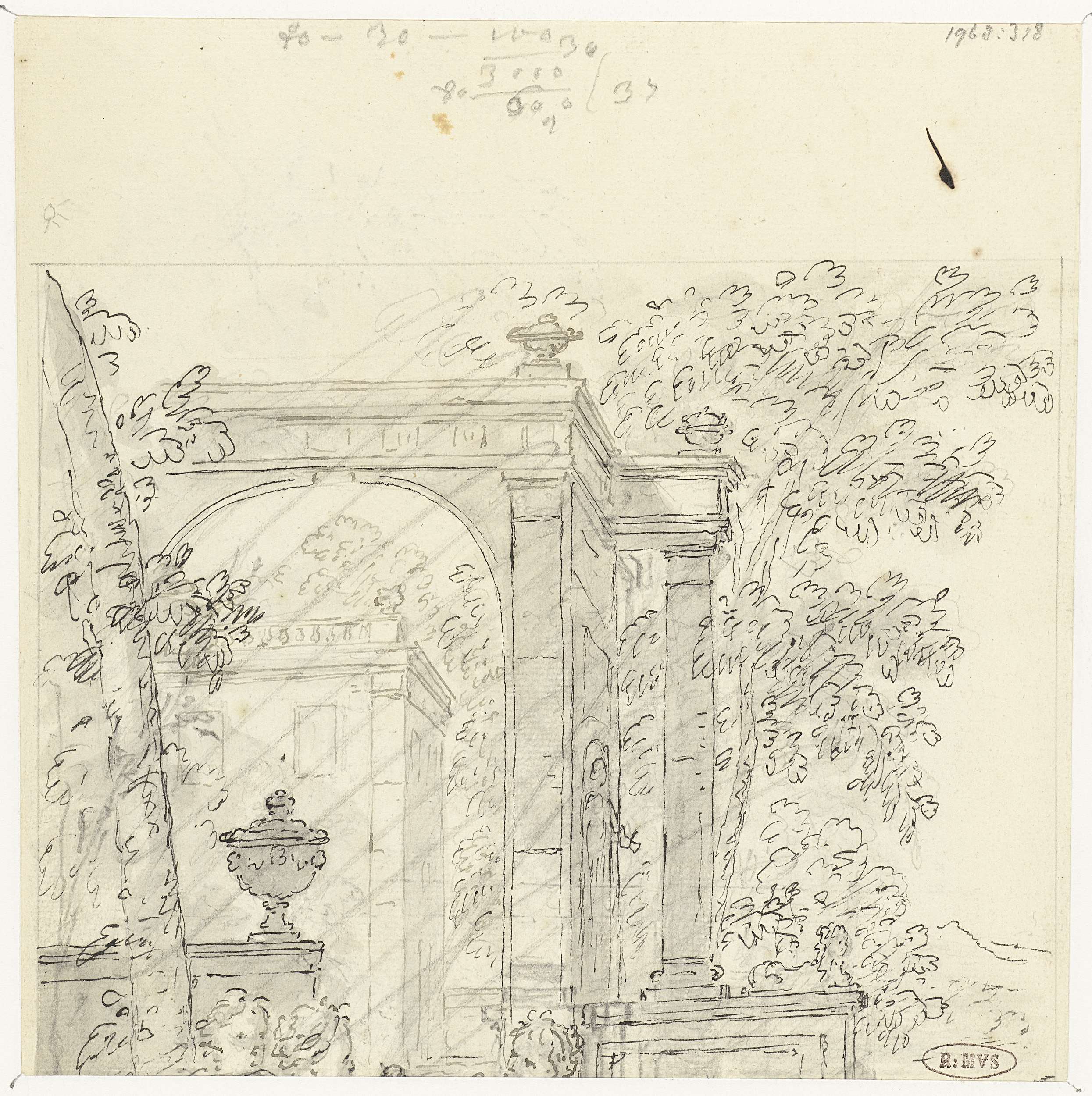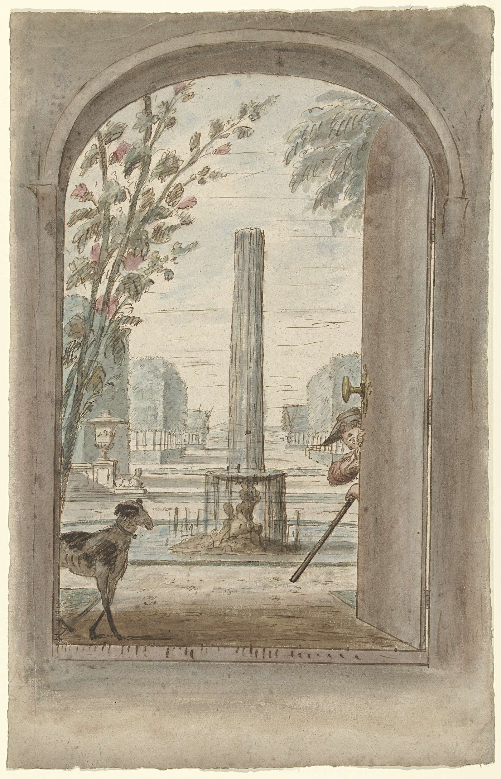 Fragment van een tuingezicht met architectuur en fig...