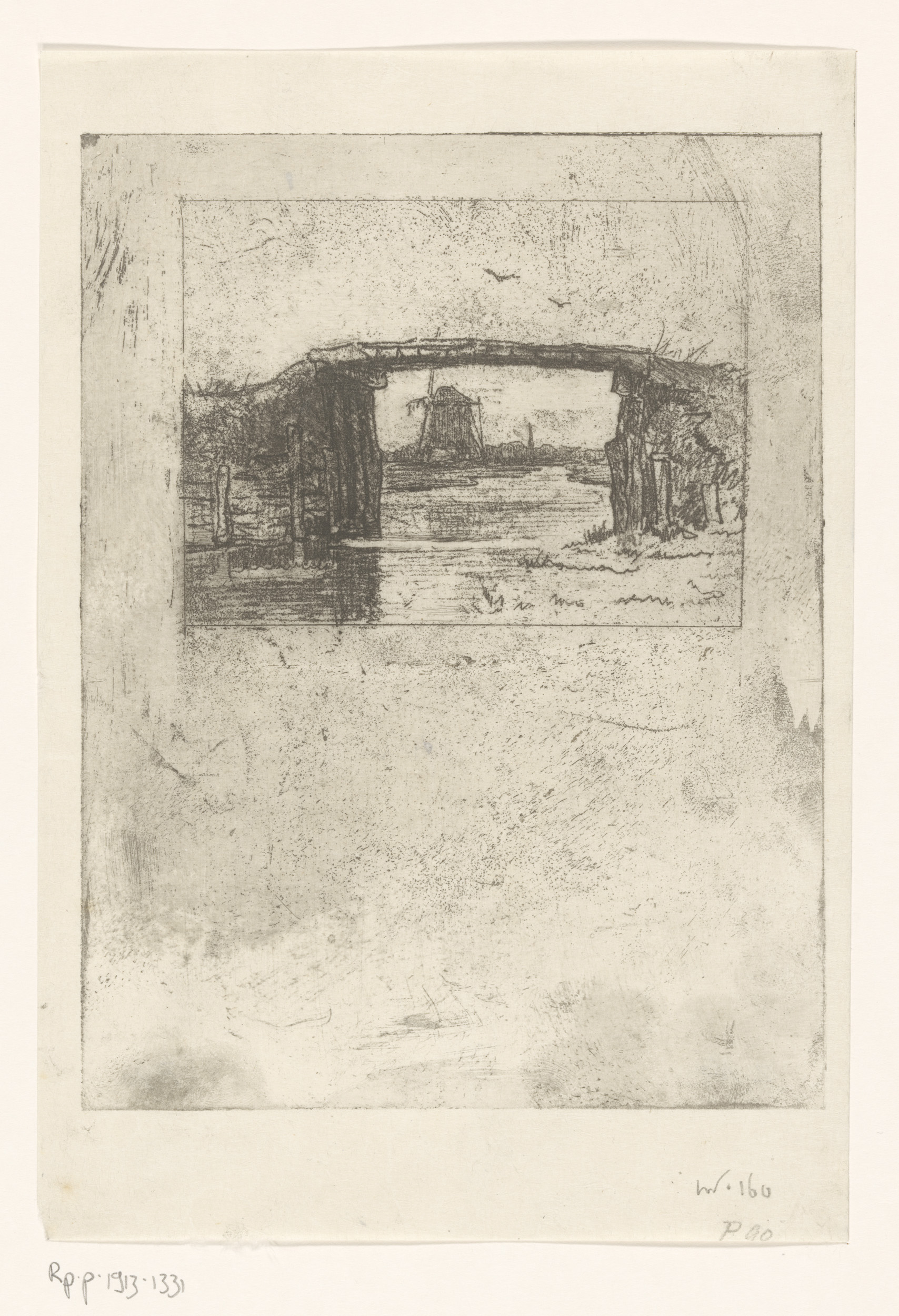 Gezicht op een molen onder een brug door