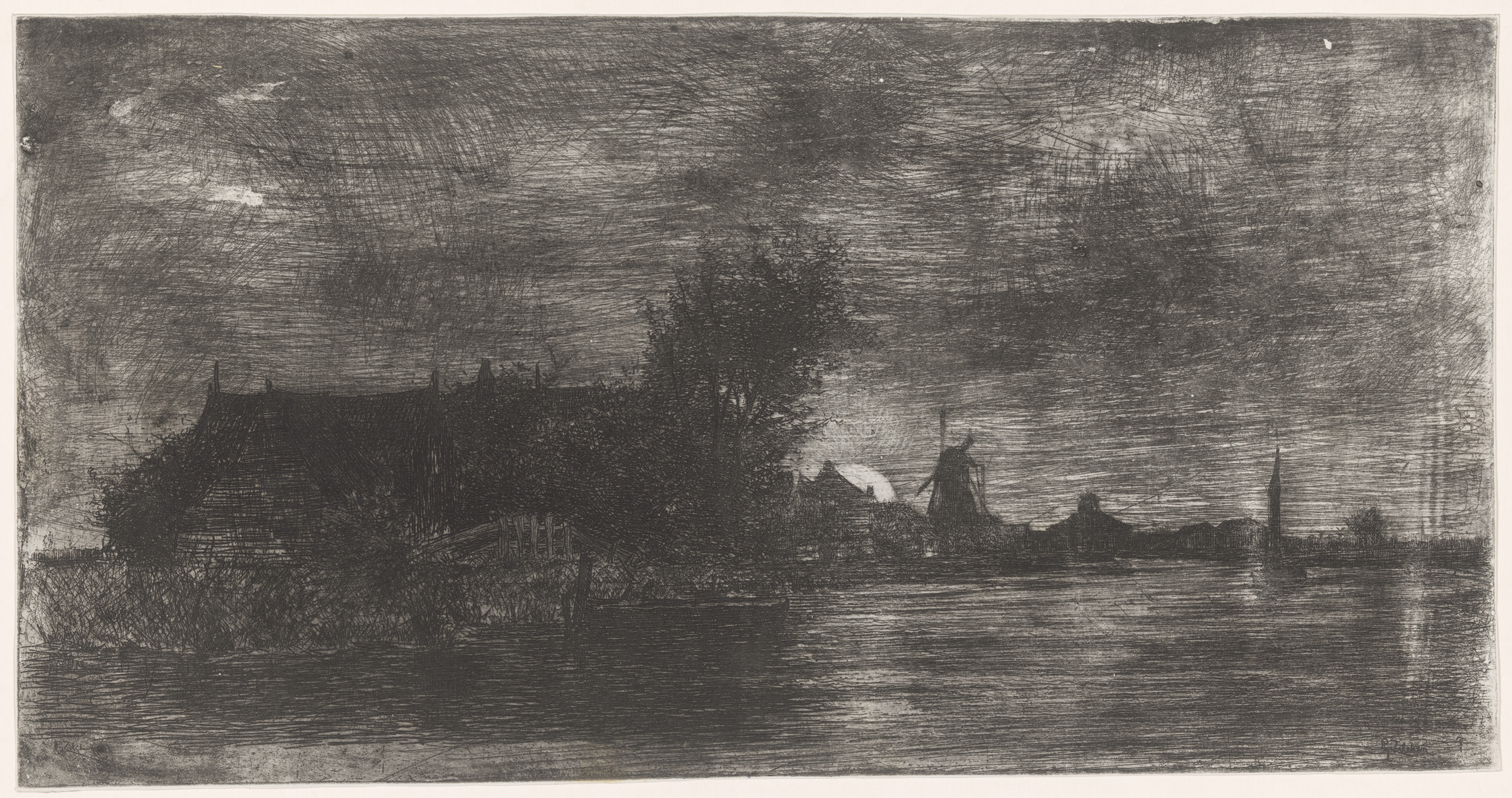 Landschap met huizen en molen aan het water