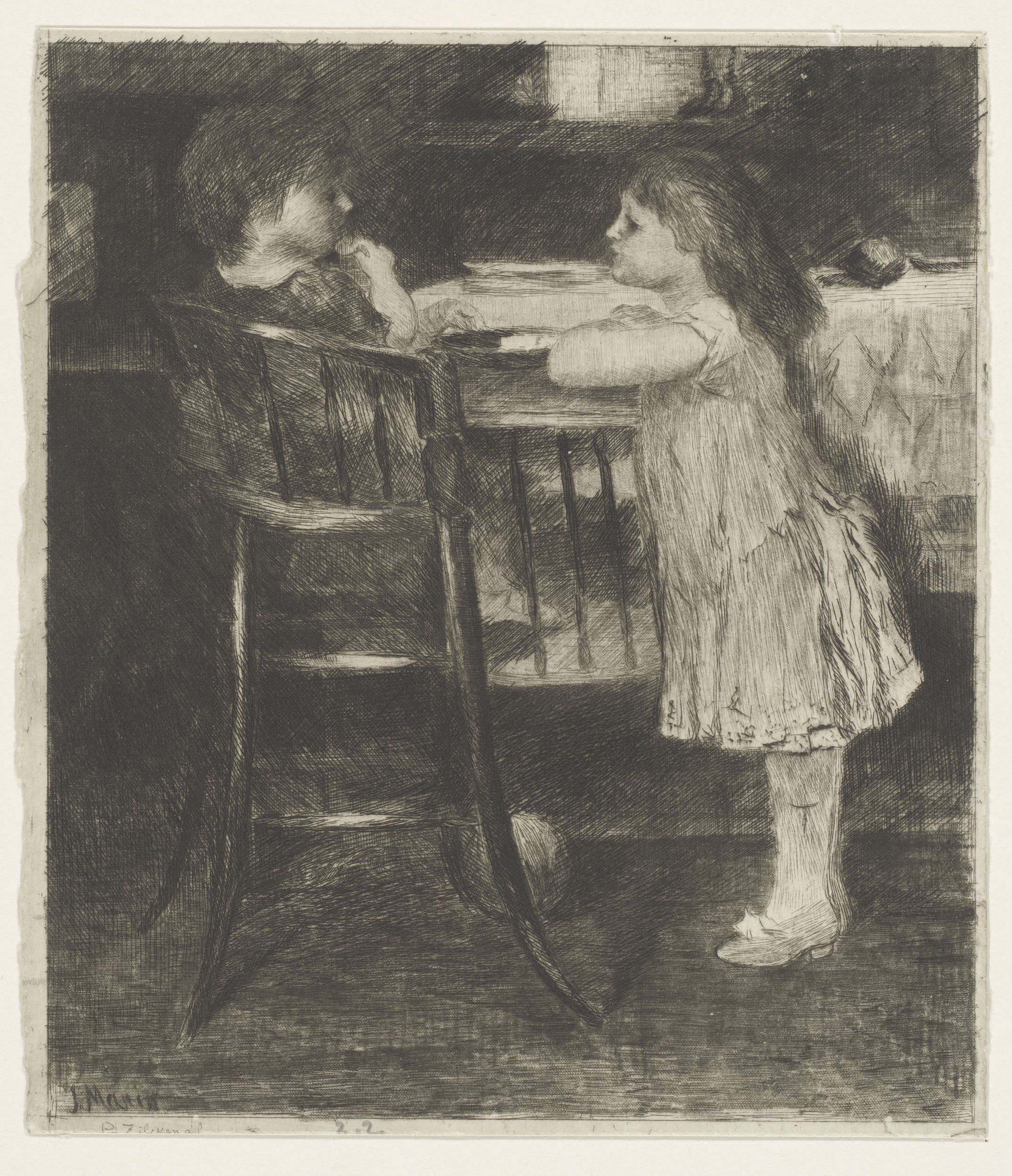 Peuter in een kinderstoel met een meisje daarop leunend