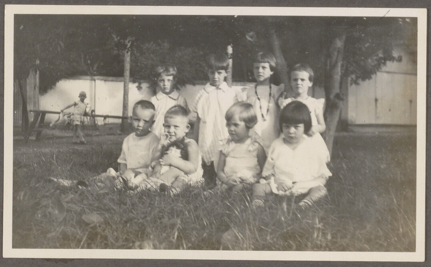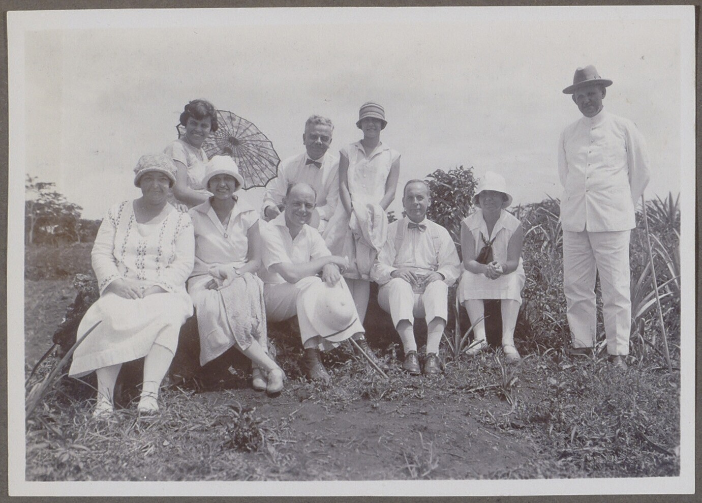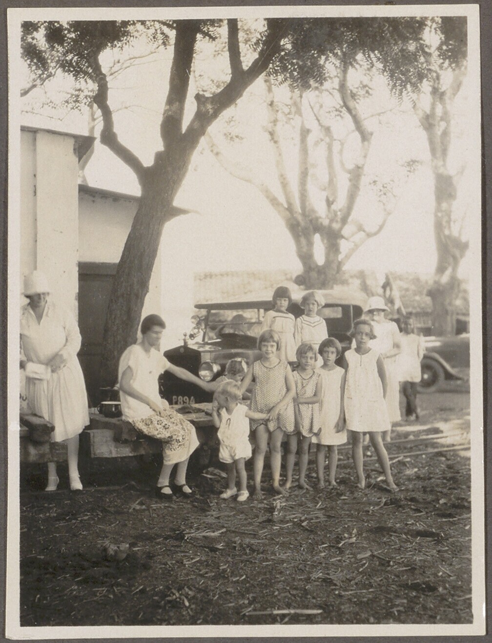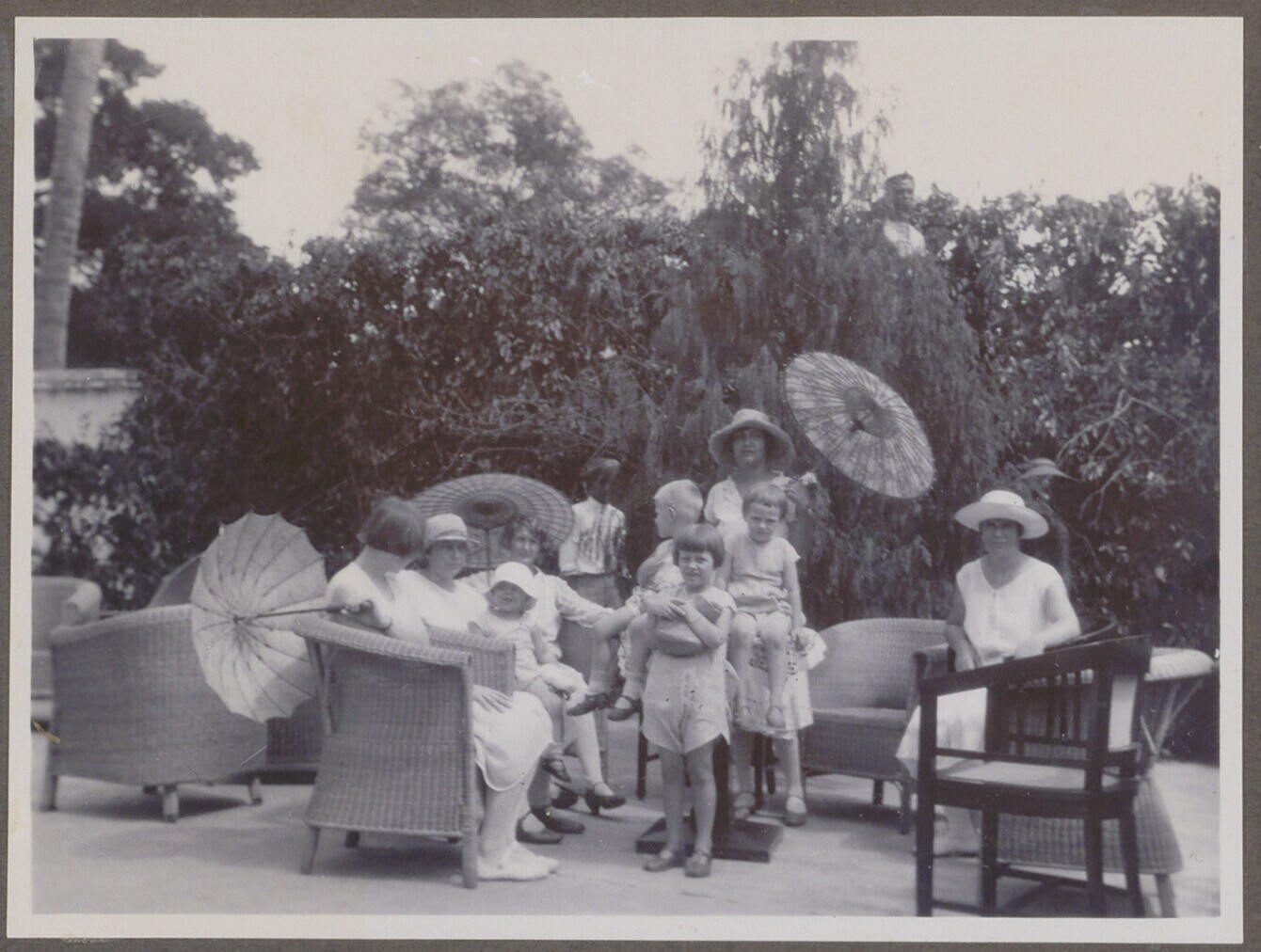 Vroouwen en kinderen zittend in tuin met parasols, J...
