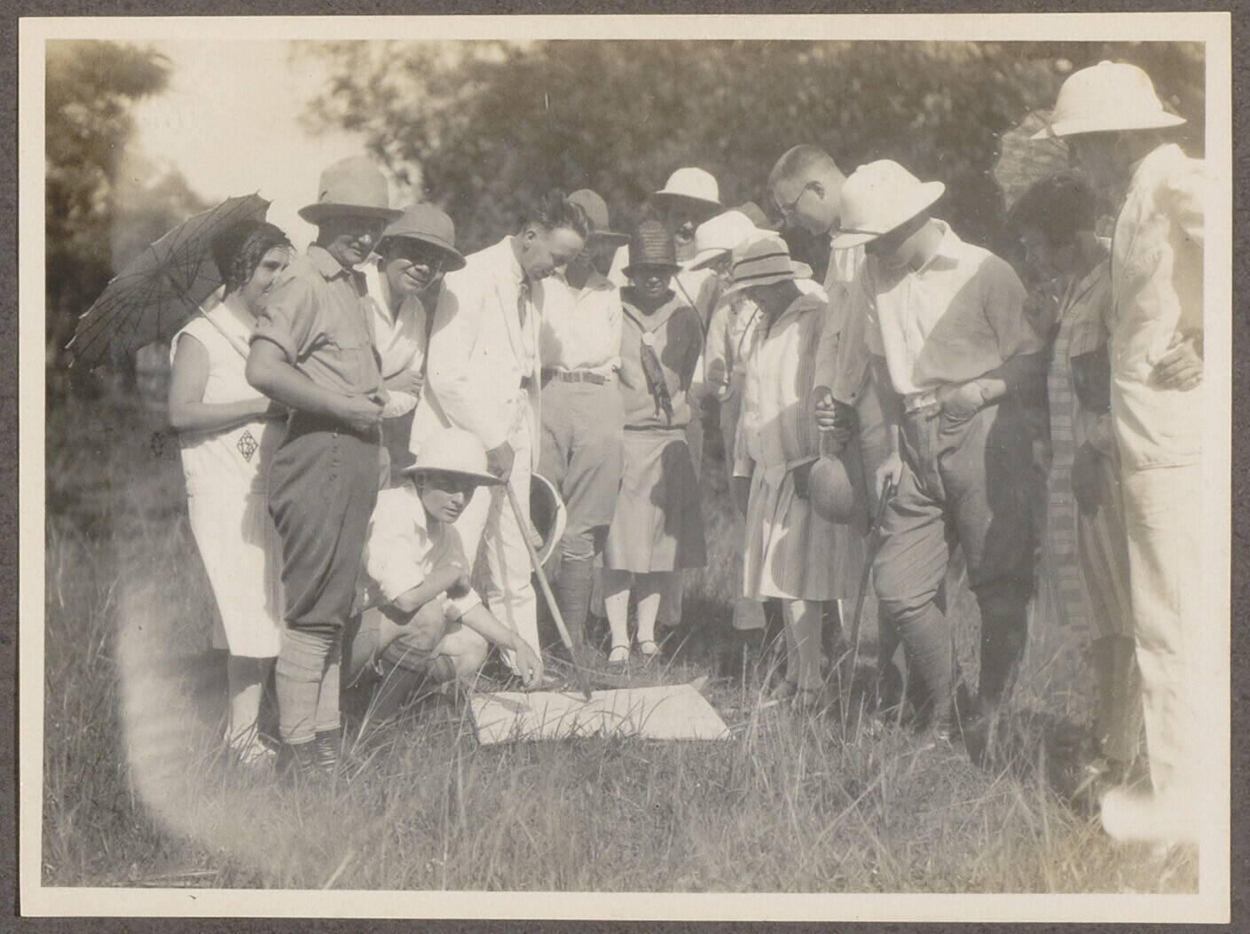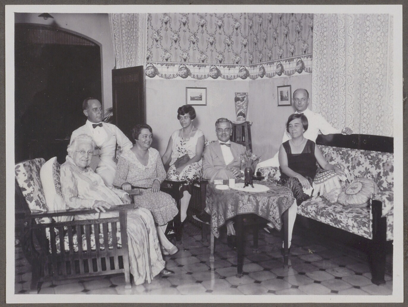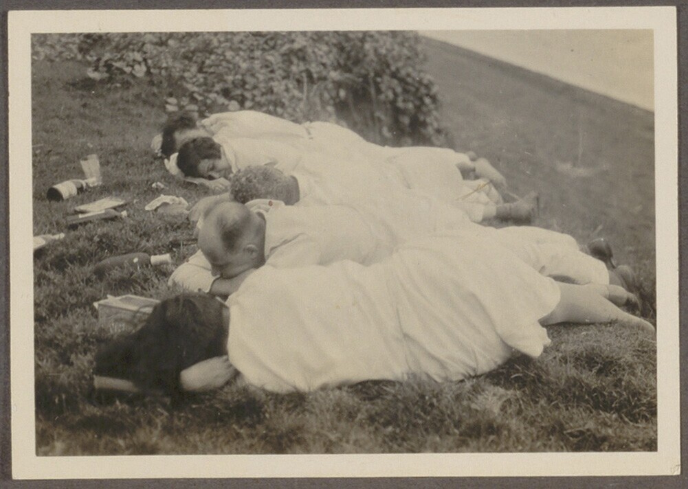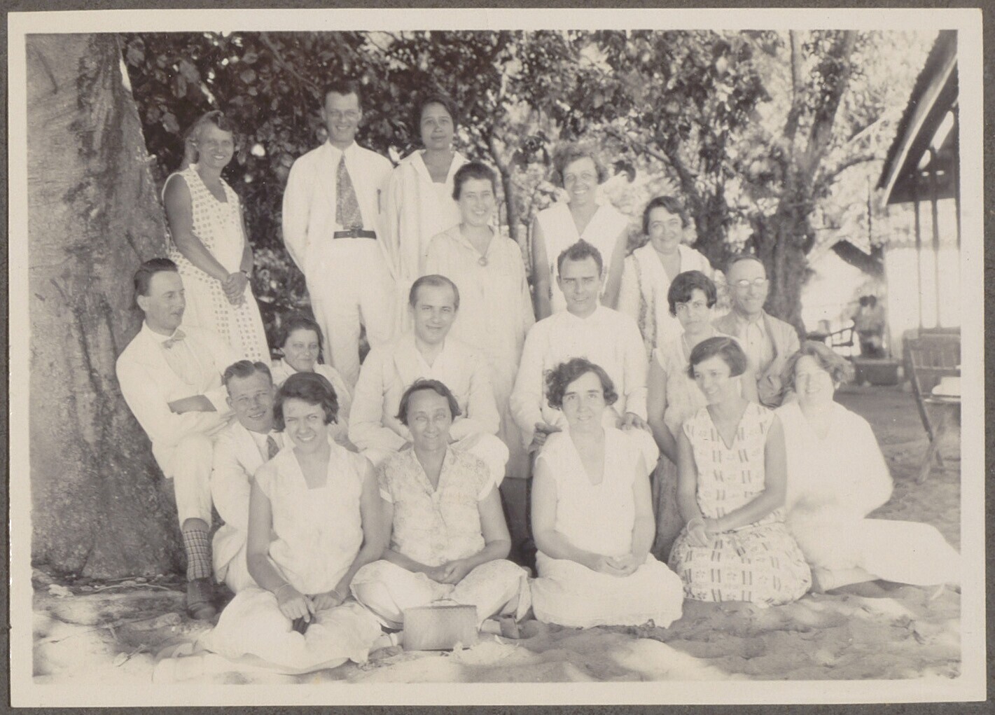 Vroouwen en kinderen zittend in tuin met parasols, J...