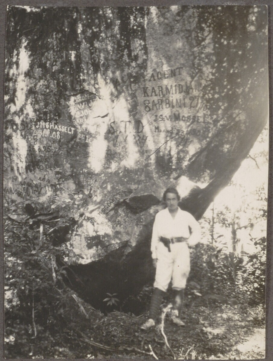 Vrouw poserend bij inscripties op top van de Batu Tu...