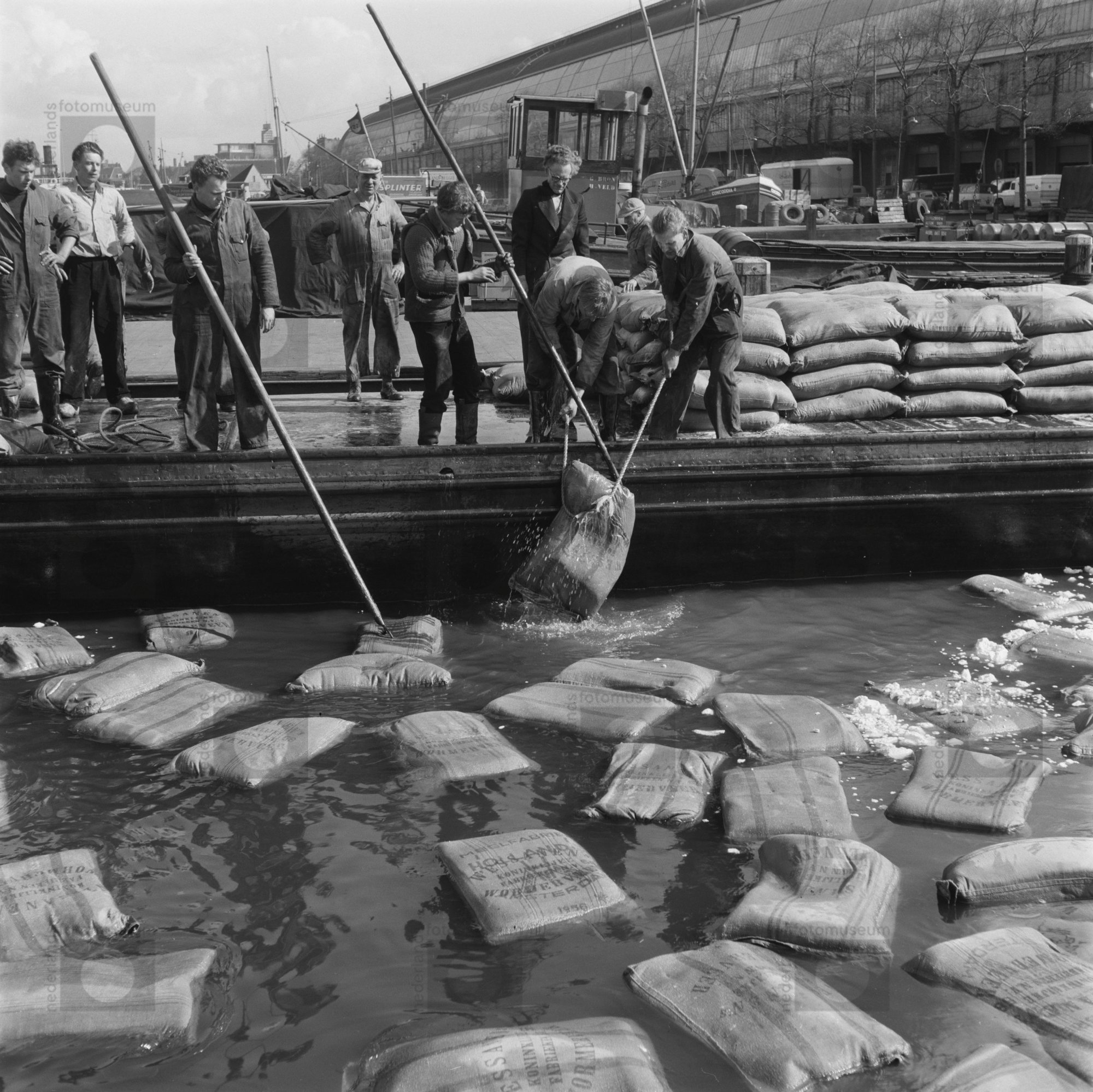 Amsterdam De Ruyterkade. Lading meelzakken zijn in h...