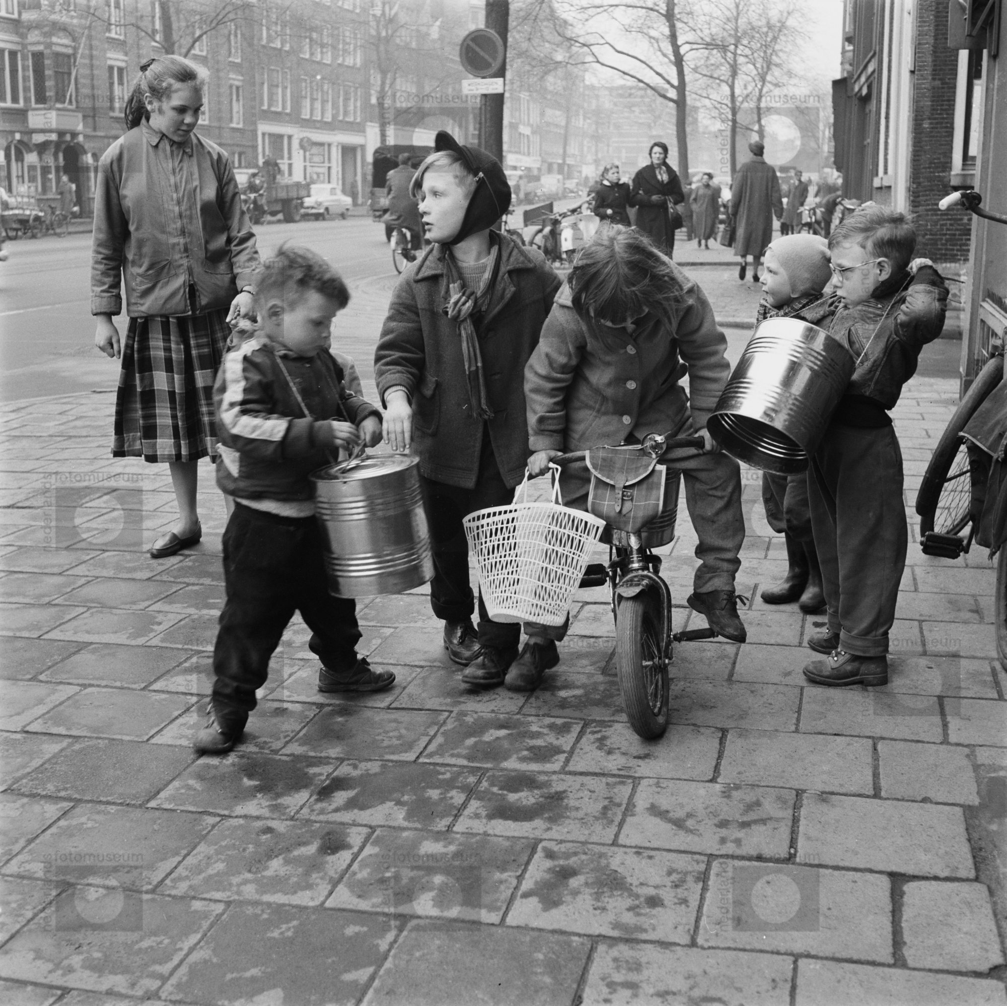 Amsterdam. Kinderen lopen met zelfgemaakte trommels ...